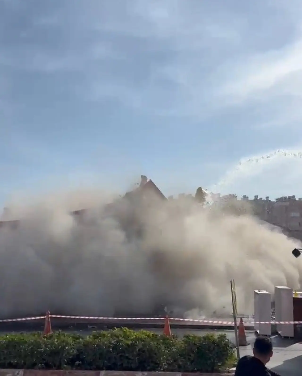 Alınan bilgiye göre, Şehit Mustafa Mahallesi Cumhuriyet Caddesinde bulunan 2 katlı bina depremde ağır hasar aldı. Yerinde dönüşüme alınarak yıkım kararı verilen bina için kontrollü yıkıma başlandı. Gerekli tedbirlerin alınmasından sonra kent merkezinde bulunan binanın titretme yöntemiyle yıkılması uygun görüldü. Binayı yıkmak için gelen iş makinesi, 2 katlı yapıya dokunmadan titreşimle binayı yıktı. Titreşim ile yıkılan 2 katlı binada toz bulutları oluştu.