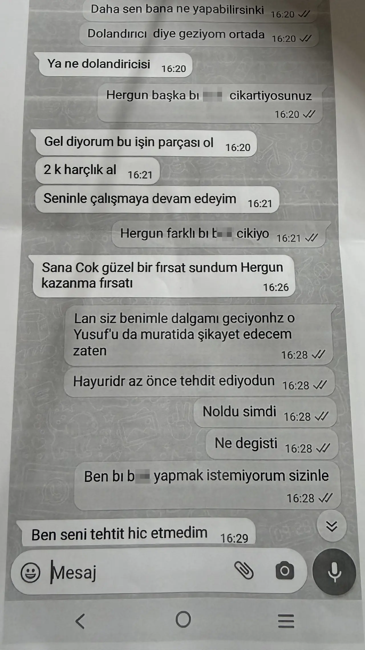 Hakkında açılan 20 davadan 11'inin ülke genelindeki çeşitli mahkemelerde sürdüğünü söyleyen Özlem Develi, M.D. hakkında şikayetçi olduğu için M.D. ve çevresindekilerin tehditlerine maruz kaldığını, M.D.'nin "Seni sabah evinden terörist diye aldırırım. Gel bu işin parçası ol, 2 bin lira harçlık al, seninle çalışmaya devam edeyim. Güzel bir kızsın, gel tatlıya bağlayalım" şeklinde kendisine mesaj attığını söyledi.