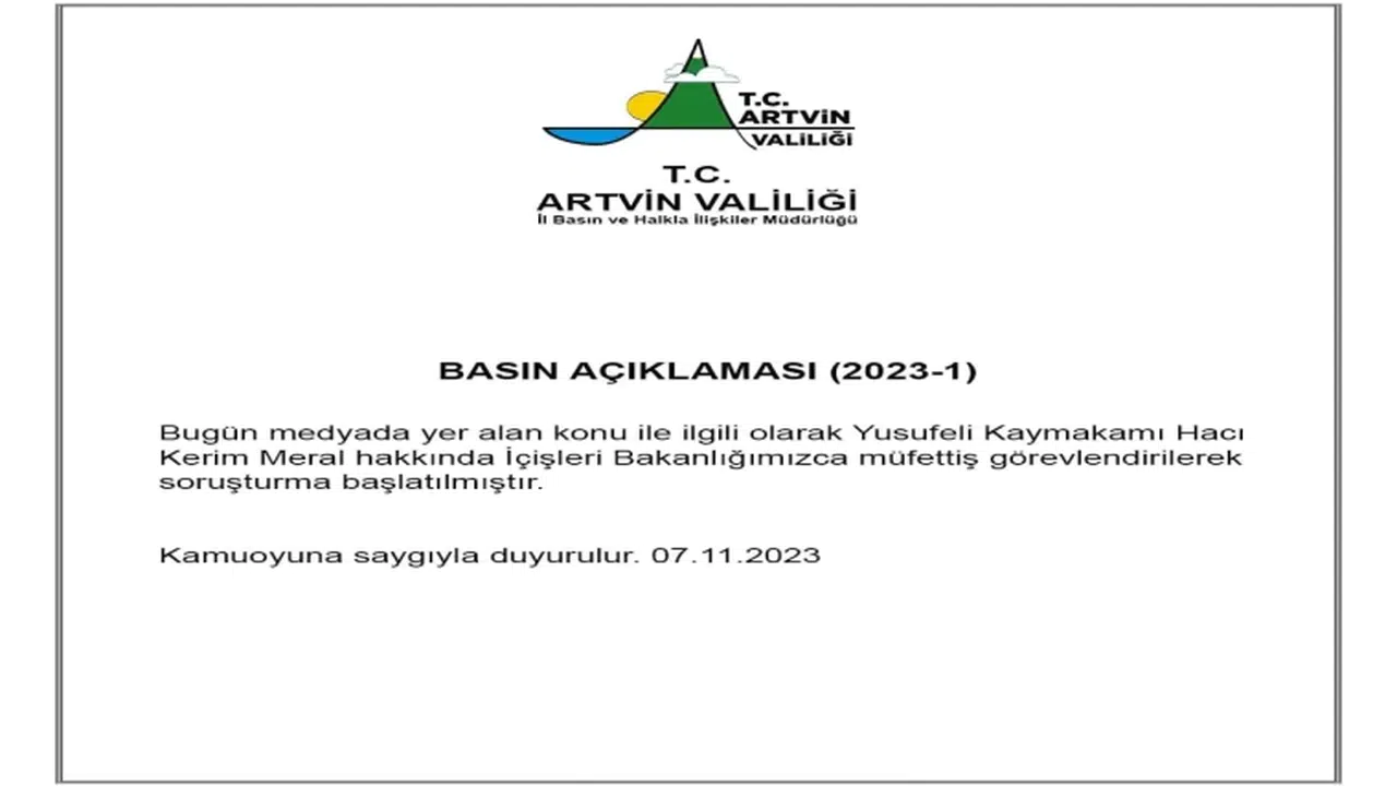 Artvin’in Yusufeli ilçesinde görev yapan Kaymakam Hacı Kerim Meral, iddialara göre yemek yediği restoranda döneri beğenmedim diyerek hesabı ödemedi. Konu gündem olurken, İçişleri Bakanlığı tarafından konuyla ilgili soruşturma başlatılırken, Artvin Valiliğinden açıklama yapıldı. Açıklamada, "Bugün medyada yer alan konu ile ilgili Yusufeli Kaymakamı Hacı Kerim Meral hakkında İçişleri Bakanlığımızca müfettiş görevlendirilerek soruşturma başlatıldı. Kamuoyuna saygıyla duyurulur” denildi.