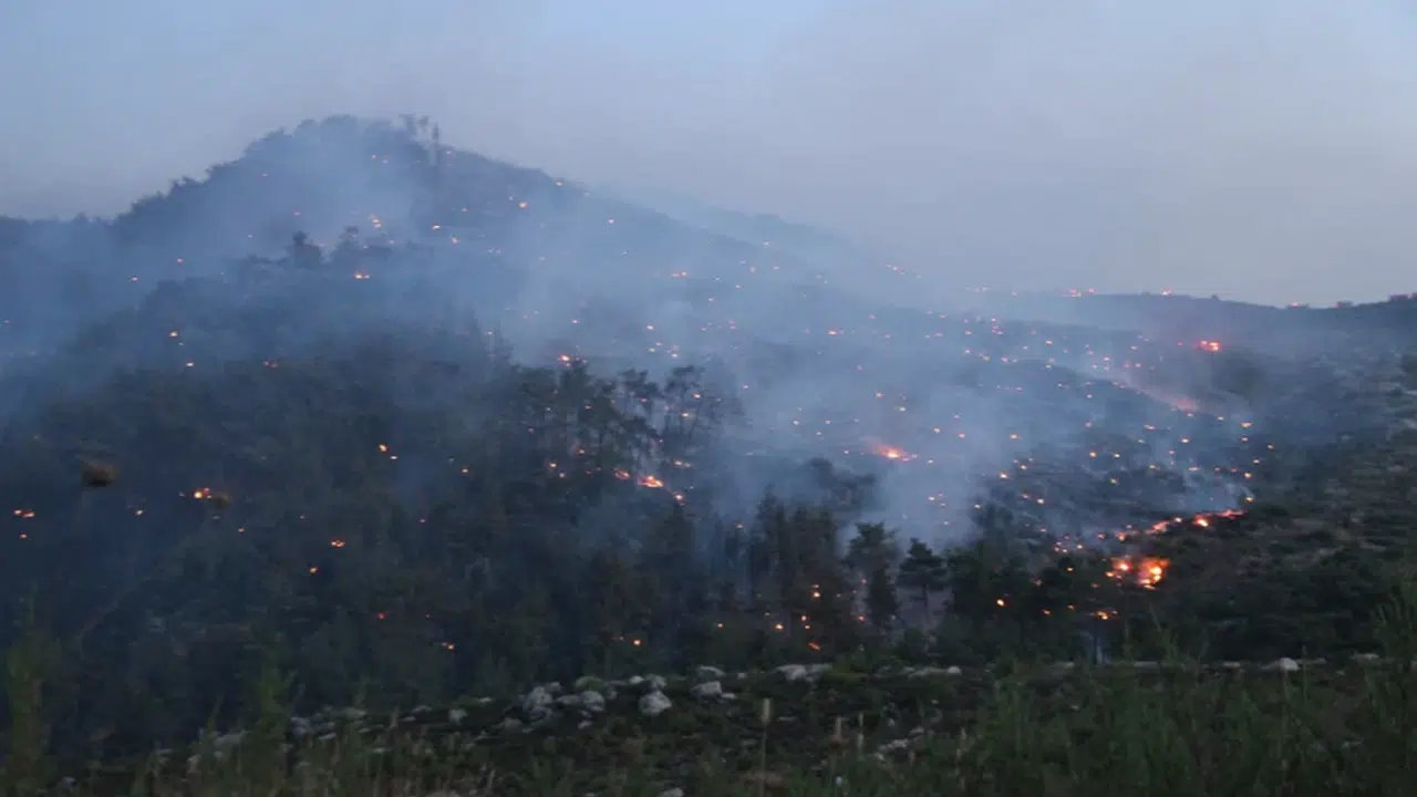 İzmir'in Menderes ilçesinde ormanlık alanda çıkan yangına gece görüşlü hava araçlarıyla müdahale sürüyor.