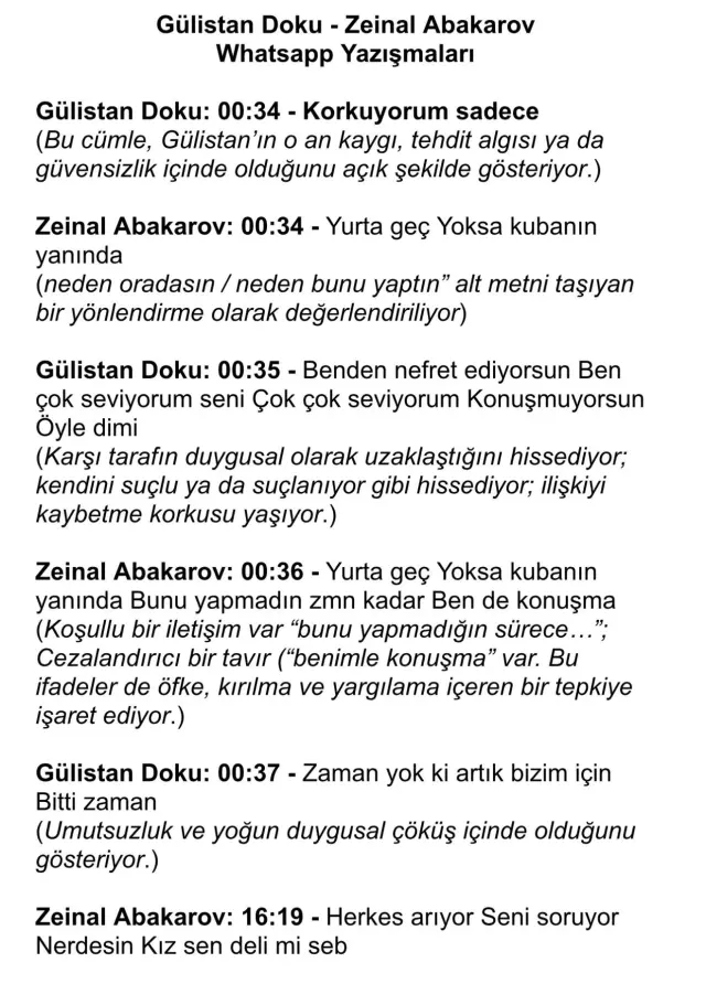 Gece saat 00:34’te Gülistan Doku’nun Abakarov’a gönderdiği “Korkuyorum sadece” mesajı, dosyanın en kritik satırlarından biri olarak öne çıktı. Uzmanlara göre bu ifade, Doku’nun o an bir tehdit algısı ya da yoğun bir güvensizlik duygusu yaşadığını açıkça ortaya koyuyor. Bu mesajın hemen ardından gelen karşılıkta ise Abakarov’un “Yurta geç, yoksa Kuba’nın yanında” şeklindeki ifadeleri, Doku’ya yönelik yönlendirici ve baskın bir dil kullandığını gösteriyor.