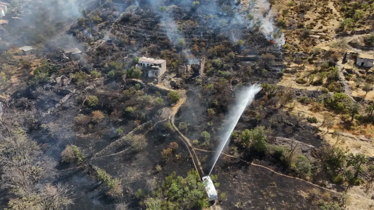 İl Emniyet Müdürlüğü’ne bağlı TOMA araçları da takviye olarak yangını söndürme çalışmalarına katılırken, ekipler alevlerin villalara ulaşmaması için yoğun çaba sarf ediyor.