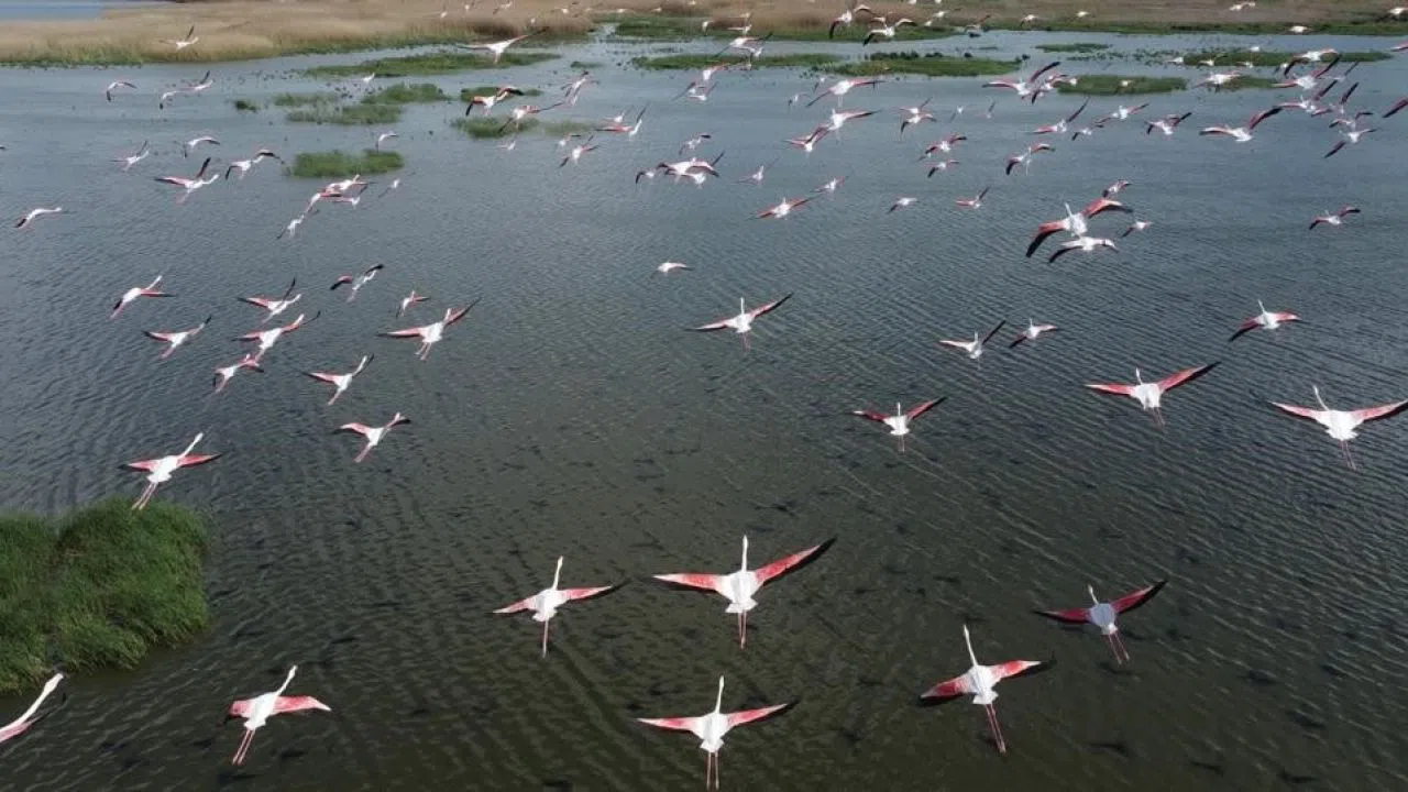 Allı turna olarak da bilinen flamingolar göç yolunda konakladıkların Eber Gölü’nde dron ile görüntülendi. Eşsiz manzaraların ortaya çıktığı görüntülerde bazı anlar ise yağlı boya tablolarını hatırlattı.