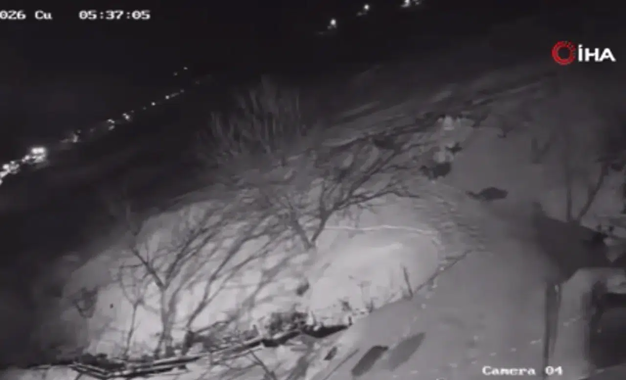 Bir evin güvenlik kamerasına yansıyan görüntülerde yaklaşık 9 yetişkin kurdun yerleşim alanı içerisinde dolaşarak yiyecek aradığı görüldü. Kurtların evlerin etrafında uzun süre gezdiği anlar kameralara saniye saniye yansıdı.