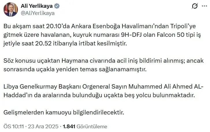 Ankara, 23 Aralık 2025 – Türkiye'nin başkenti Ankara bu akşam kritik bir gelişmeyle sarsıldı. Esenboğa Havalimanı’ndan saat 20.10’da Libya’nın başkenti Trablus’a (Tripoli) gitmek üzere havalanan Malta tescilli Falcon 50 tipi iş jetiyle yaklaşık 40 dakika sonra, saat 20.52 itibarıyla irtibat kesildi.