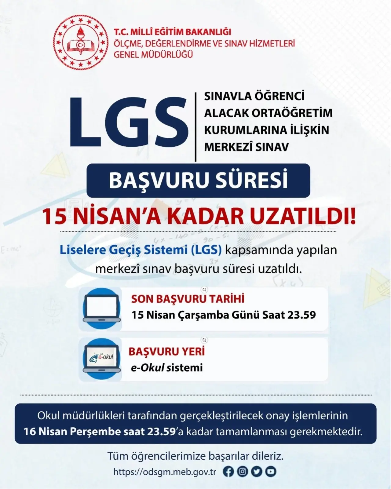 Millî Eğitim Bakanlığınca 13 Haziran'da düzenlenecek Liselere Geçiş Sistemi (LGS) kapsamındaki merkezi sınavın başvuru süresi 15 Nisan Çarşamba gününe kadar uzatıldı. Öğrenci başvuru süresi 15 Nisan Çarşamba günü saat 23.59'a kadar, okul müdürlükleri tarafından yapılacak başvuru onayları ise 16 Nisan Perşembe günü saat 23.59’a kadar uzatıldı. Katılımın isteğe bağlı olduğu merkezi sınav için başvurular, 15 Nisan saat 23.59'a kadar "e-Okul" üzerinden yapılabilecek.