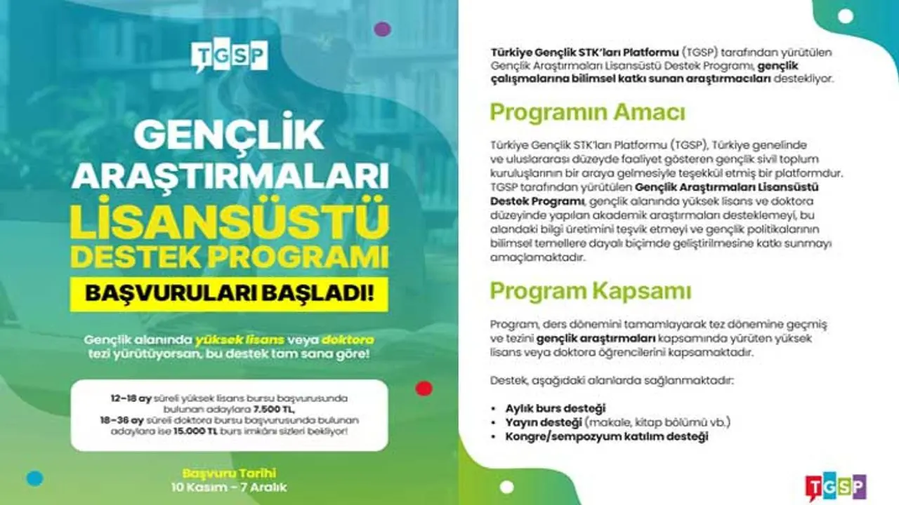 Türkiye Gençlik STK’ları Platformu (TGSP), gençlik politikalarının bilimsel temellere oturtulması hedefiyle önemli bir burs programını devreye aldı. "Gençlik Araştırmaları Lisansüstü Destek Programı" adıyla sunulan bu fırsat, yüksek lisans ve doktora düzeyinde tez aşamasındaki öğrencilere aylık maddi destek sağlamayı amaçlıyor.