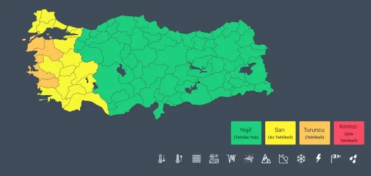 Turuncu: Hava durumu tehlikeli. Tahmin edilen meteorolojik hadise sıklıkla görülmemekte. Hasar ve kayıpların oluşması muhtemel. Çok tedbirli olmalı, güncel meteorolojik koşullar ve tahminler takip edilmeli.
