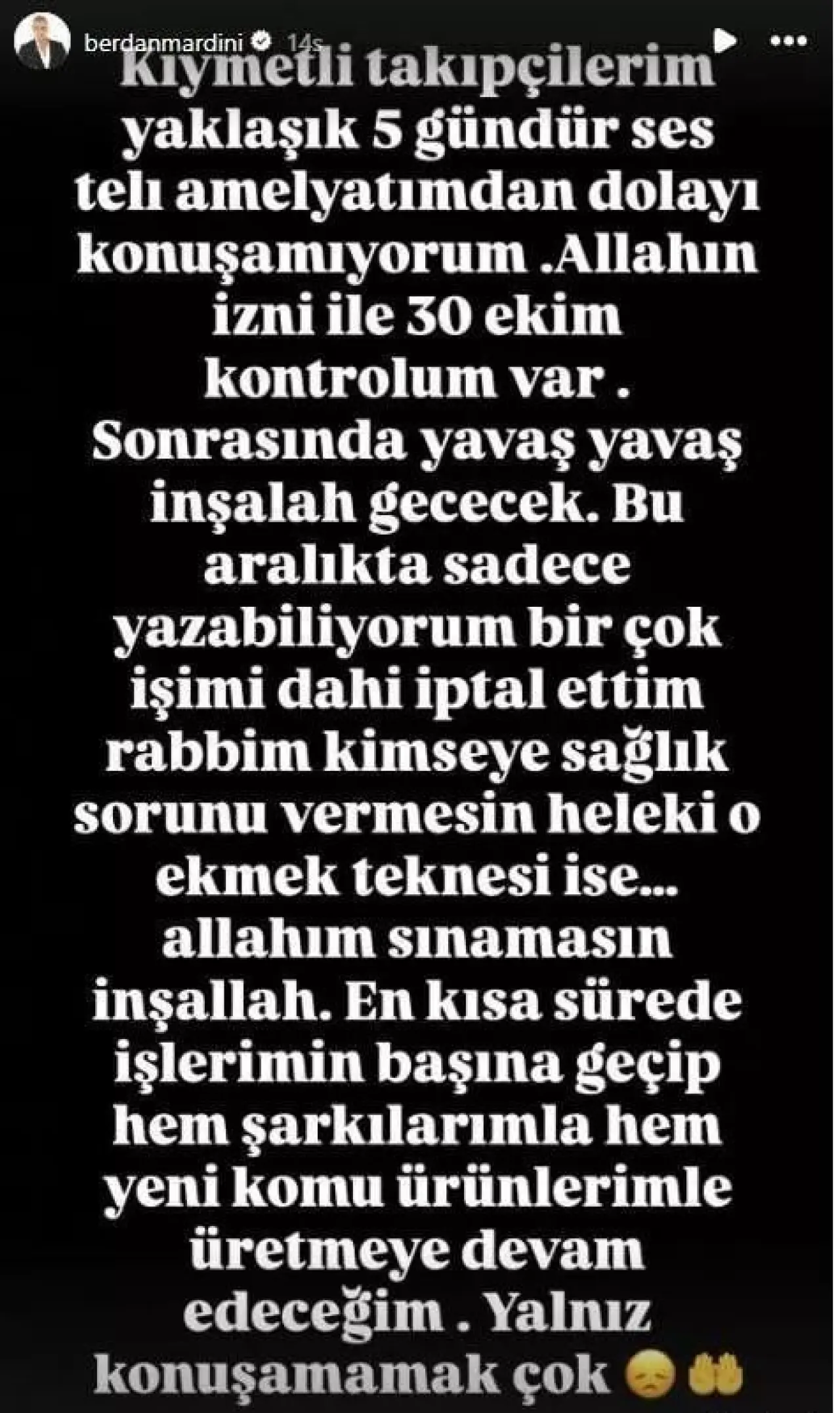 Berdan Mardini, yaklaşık beş gündür konuşamadığını belirterek, "Allah'ın izniyle 30 Ekim'de kontrolüm var. Sonrasında inşallah yavaş yavaş geçecek" ifadelerini kullandı. Ünlü sanatçının, bu süre boyunca yalnızca yazı yoluyla iletişim kurabildiği öğrenildi.