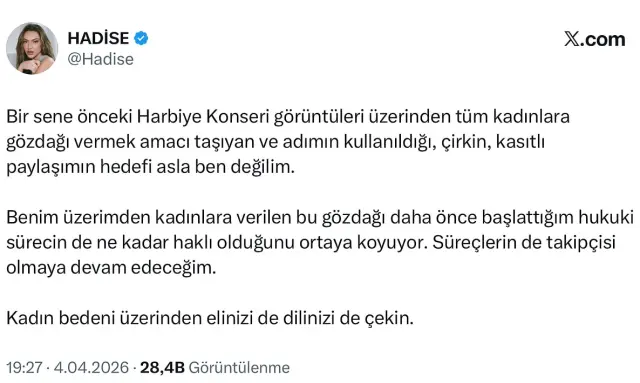 Burhan’ın açıklamaları sosyal medyada tartışma yaratırken, Hadise’den de yanıt gecikmedi. Sosyal medya üzerinden yaptığı açıklamada kullanılan dilin hedef gösterici olduğunu belirten Hadise, şu ifadelere yer verdi: "Bir sene önceki Harbiye Konseri görüntüleri üzerinden tüm kadınlara gözdağı vermek amacı taşıyan ve adımın kullanıldığı, çirkin, kasıtlı paylaşımın hedefi asla ben değilim. Benim üzerimden kadınlara verilen bu gözdağı daha önce başlattığım hukuki sürecin de ne kadar haklı olduğunu ortaya koyuyor. Süreçlerin de takipçisi olmaya devam edeceğim. Kadın bedeni üzerinden elinizi de dilinizi de çekin.”
