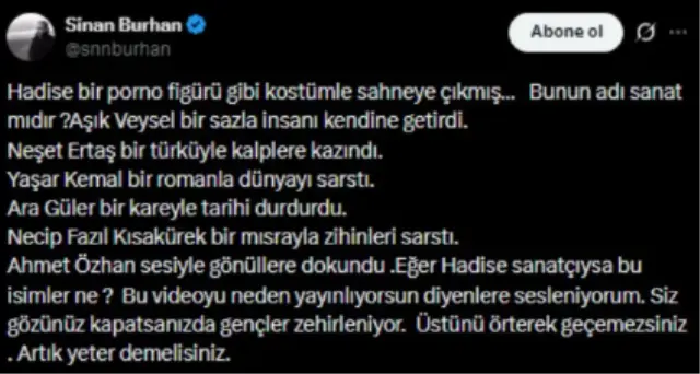 Sinan Burhan, sosyal medya hesabından yaptığı paylaşımında Hadise’nin sahne tarzını sert ifadelerle eleştirerek, “ Hadise p.rno figürü gibi kostümle sahneye çıkmış… Bunun adı sanat mıdır?” dedi. Burhan, paylaşımında Türk kültür ve sanat dünyasının önemli isimlerini örnek göstererek eleştirisini sürdürdü. Aşık Veysel, Neşet Ertaş, Yaşar Kemal, Ara Güler, Necip Fazıl Kısakürek ve Ahmet Özhan gibi isimleri anan Burhan, bu sanatçıların eserleriyle topluma kalıcı değerler kattığını vurguladı. Burhan, "Eğer Hadise sanatçıysa bu isimler ne?" diye sordu.