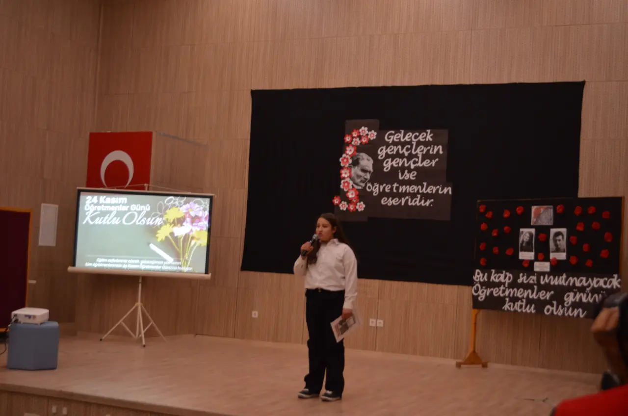Saygı duruşunda bulunulması ve İstiklal Marşı’nın okunmasının ardından program, Kur’an-ı Kerim tilavetiyle devam etti. Programda günün önemiyle ilgili konuşmayı yapan Fatih Ortaokulu Müdürü Kazım Tokkaş öğretmenlere her alanda ihtiyaç duyulduğunu belirterek, "Öğretmenlerin eğitim- öğretim hayatının başlangıcından sonuna kadar tesir etmediği hiçbir alan yoktur. Bugünlere kadar gelinen noktada öğretmenlerimizin emekleri vardır. Başöğretmen Gazi Mustafa Kemal’i, öğrencilerini yetiştirmek uğruna şehadete yürüyen öğretmenlerimizi ve bizlere emek veren tüm hocalarımızı saygıyla minnetle yad ediyorum. Öğretmen arkadaşlarımızın ve tüm eğitim camiamızın 24 Kasım Öğretmenler Günü’nü kutluyorum." diye konuştu.