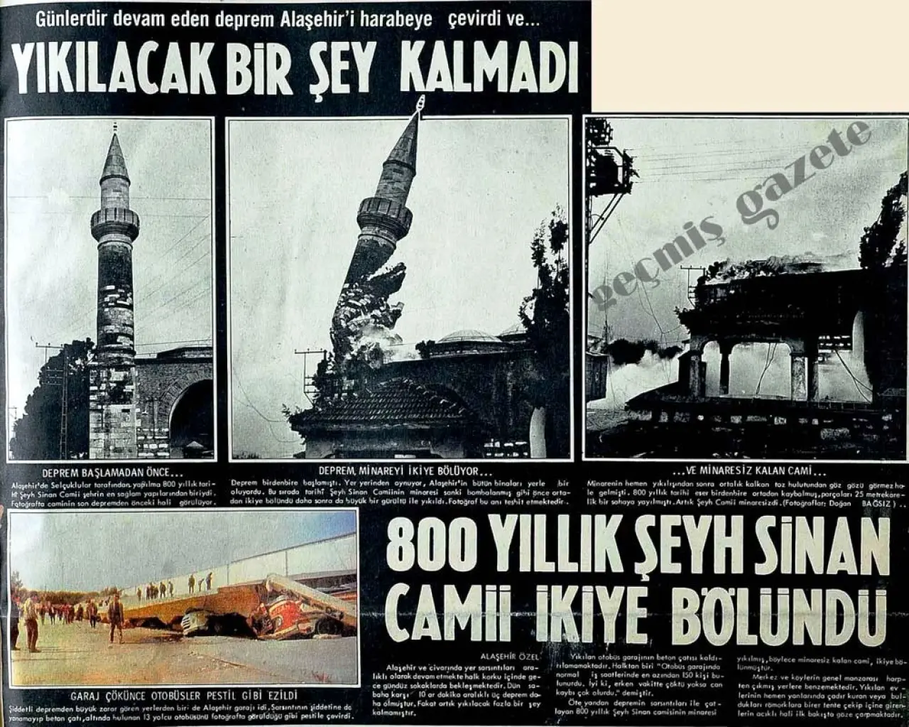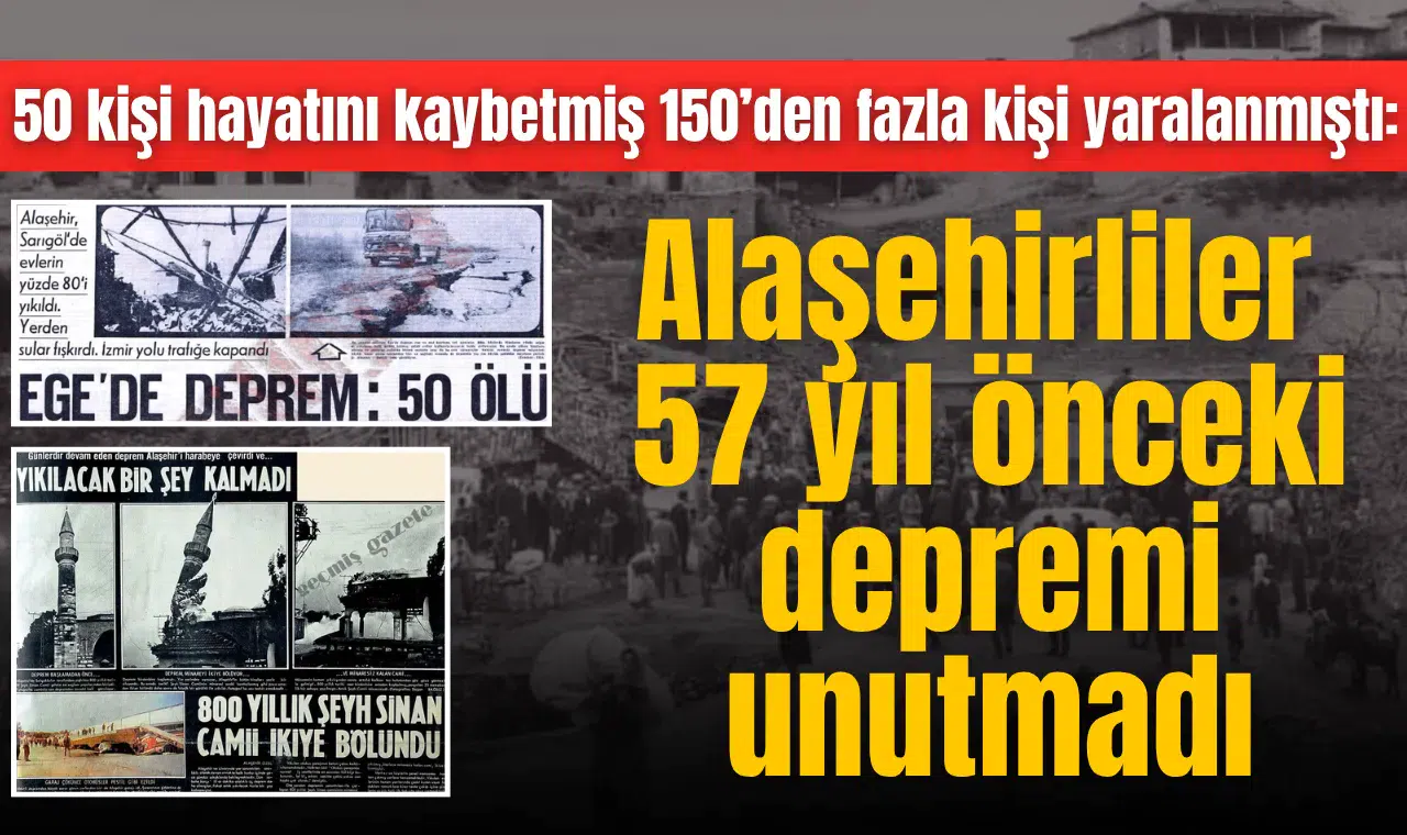 Alaşehir’de 28 Mart 1969 tarihinde, Kandilli Rasathanesi kayıtlarına göre 6,5 büyüklüğünde meydana gelen depremin üzerinden 57 yıl geçmesine rağmen izlerini görmek mümkün. Bu depremde 50 kişi yaşamını yitirmiş ve 150 kişide yaralanmıştı. Tamamen yıkılan veya çok ağır hasar gören ev ve iş yerinin sayısı ise 4 bin 651 olarak kayıtlara geçti. 800 yıllık Şeyh Sinan Camisi de depremde yerle bir olmuştu. Depremin ardından gazete manşetlerinde, “Alaşehir ve Sarıgöl’de evlerin yüzde 80’i yıkıldı, yer altından sular fışkırdı. İzmir yolu trafiğe kapandı. Tarihten bir miras kalan 800 yıllık Şeyh Sinan Camii yaşanan deprem sonrası ortadan ikiye bölündü” ifadeleriyle yer almış, dönemin Başbakanı Süleyman Demirel bölgeye ziyarete geldiğinde, “Her şeyi yeniden inşa edeceğiz” demişti.