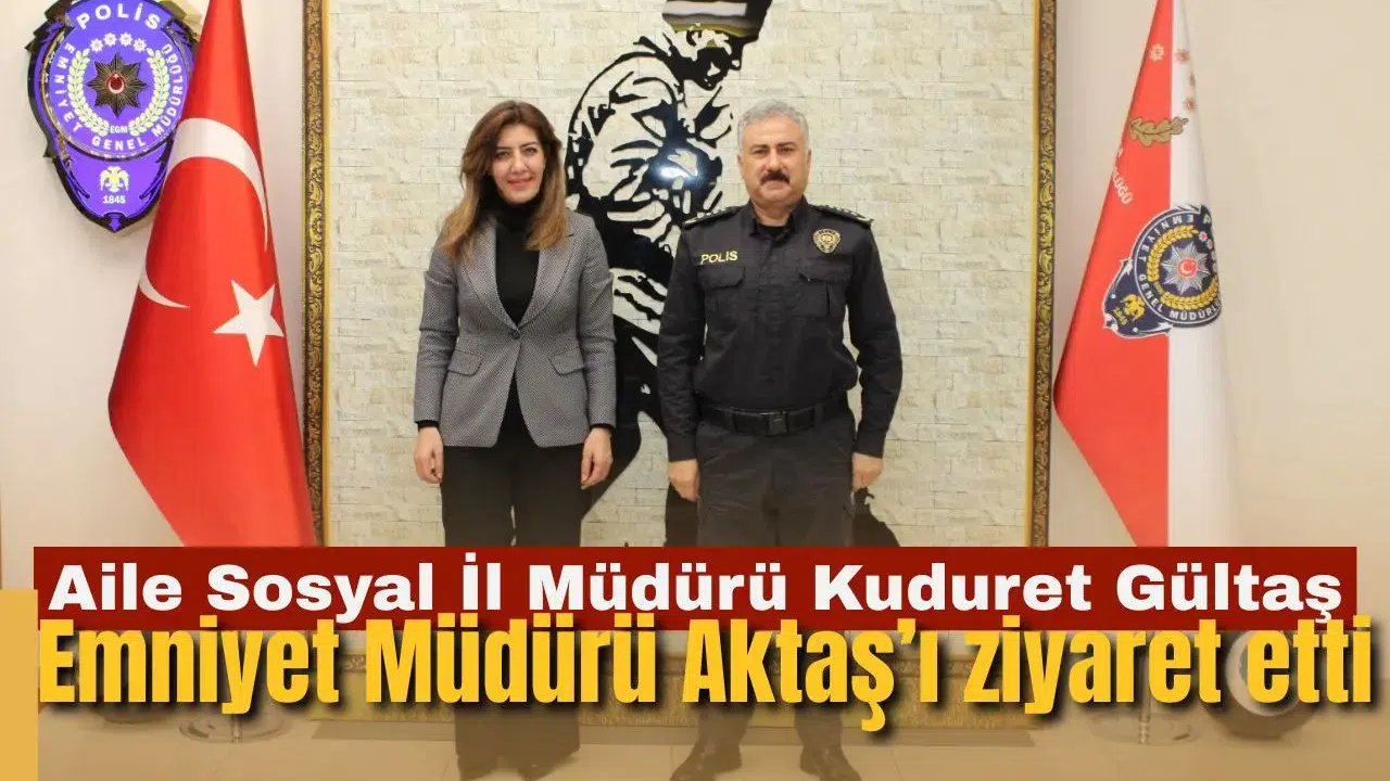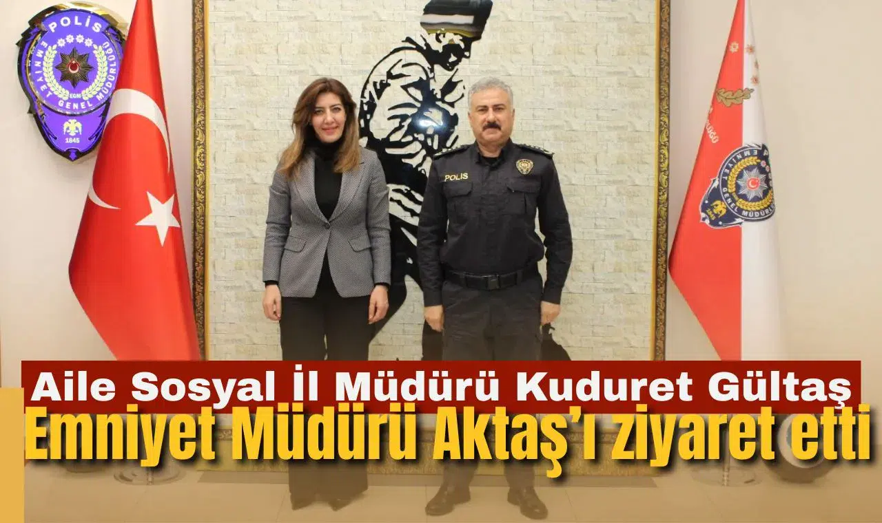 İl Emniyet Müdürü Fahri Aktaş’ın, geçtiğimiz günlerde Aile ve Sosyal Hizmetler İl Müdürü Kuduret Gültaş’a gerçekleştirdiği hayırlı olsun ziyaretinin ardından, Gültaş da Aktaş’ı makamında ziyaret etti. Gültaş, kamu kurumları arasındaki koordinasyonun önemine dikkat çekerek, Emniyet Teşkilatı ile özellikle sosyal hizmetler alanında yürütülen ortak çalışmalara verdikleri önemi ifade etti. Emniyet Müdürü Aktaş da ziyaretten duyduğu memnuniyeti dile getirdi. Ziyaret karşılıklı iyi dilek temennileriyle son buldu.