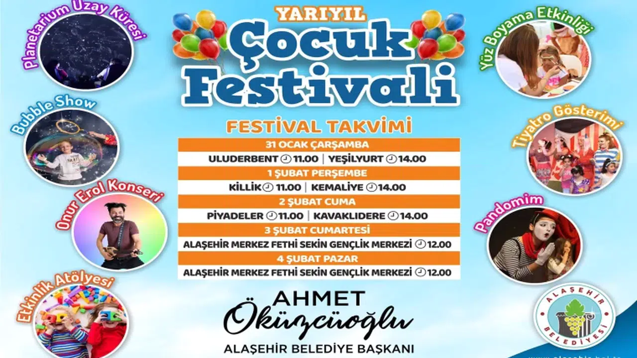 Alaşehir Belediyesi Şehit Fethi Sekin Gençlik Merkezinde Yarıyıl Çocuk Festivali düzenliyor. Yarıyıl tatilinde çocuklar için 'Yüz Boyama Etkinliği', 'Tiyatro Gösterimi', 'Bubble Show', 'Onur Erol Konseri', 'Etkinlik Atölyesi', 'Pandomim' ve daha fazla etkinlikler çocukların doya doya eğlenmesini sağlayacak.