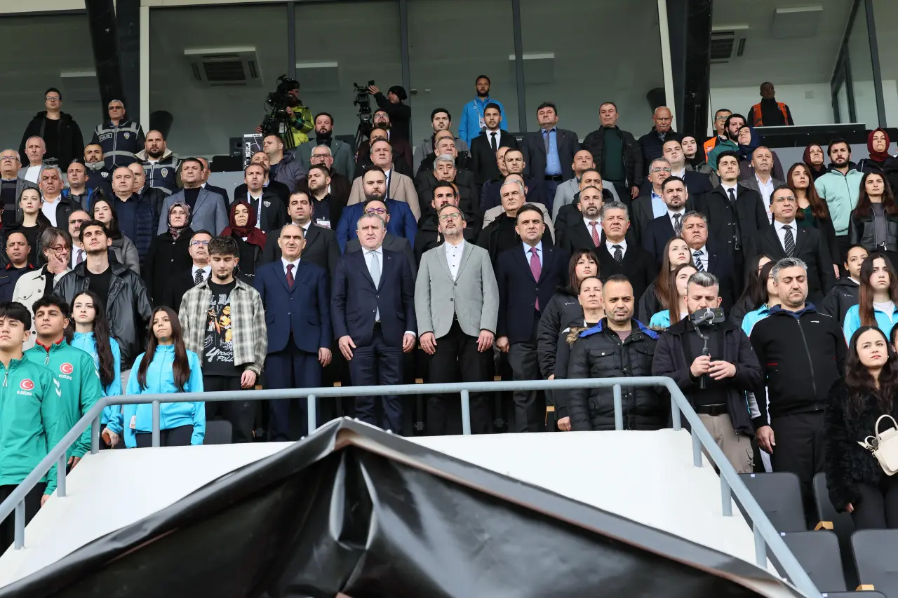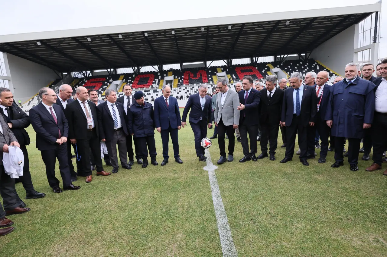 Açılış kurdelesinin kesilmesinin ardından protokol üyeleri ve taraftarlar, stadyumdaki ilk maç heyecanına ortak oldu.