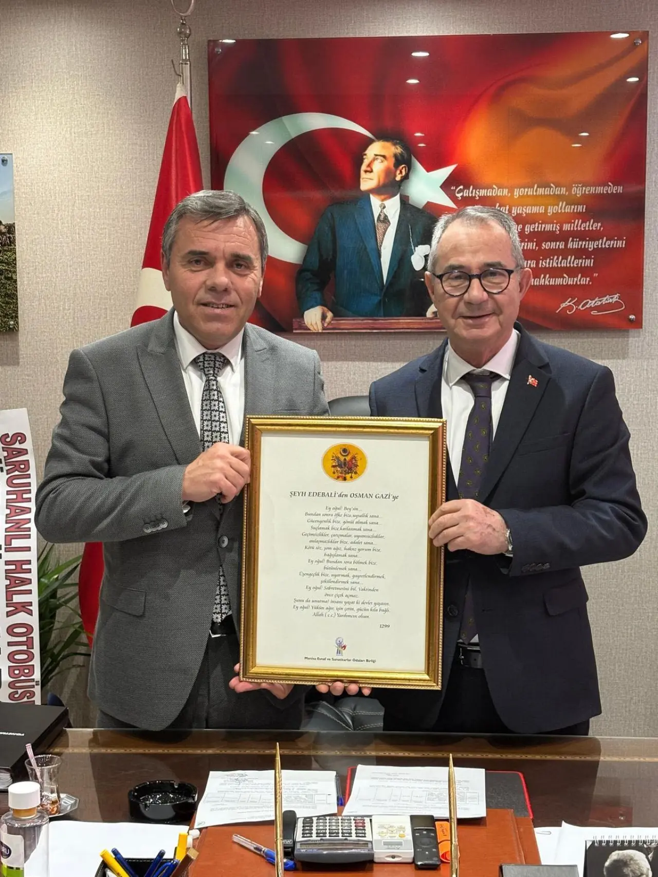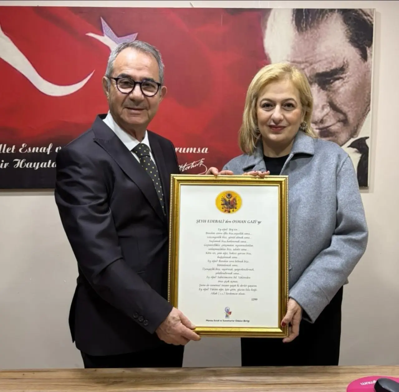 Başkan Hasan Geriter, ziyaret ettiği başkanlara Şeyh Edebali'den Osman Gazi'ye Vasiyetinin yer aldığı tabloyu hediye etti. Yeni başkanlara görevlerinde başarılar dileyen Geriter, “Göstermiş olduğu misafirperverlik için teşekkür eder, yönetim ve denetim kurulu üyeleriyle birlikte çalışmalarında başarılar dilerim” dedi.