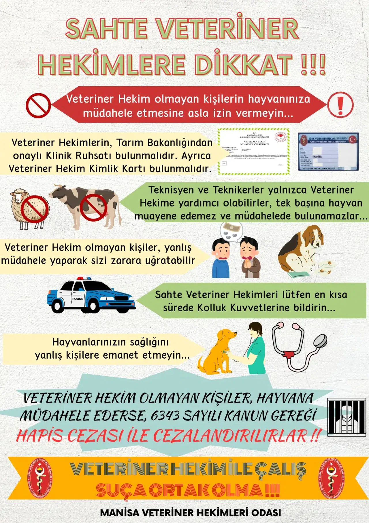 Manisa ilimizde de zaman zaman Veteriner Hekim olmayan kişilerin hayvanlara müdahale ettikleri, hayvanlara suni tohumlama ve tedavi yapmaya çalıştıkları, hatta ilaç satışı yaptıkları konusunda bilgiler ulaşmaktadır. Özellikle Kula ve Salihli gibi hayvancılığın yoğun yapıldığı ilçelerimizde teknisyen ya da tekniker vasfında olan bazı kişilerin hiçbir eğitimi ve yetkisi olmadığı halde yetiştiricilere kendilerini Veteriner Hekim olarak tanıttıkları ve hayvanlarda uygulamalar yaptıkları Meslektaşlarımızca tarafımıza iletilmektedir. Bu doğrultuda Kamuoyunu ve yetiştiricilerimizi aydınlatma ihtiyacı duyulmuştur. hukuki sorumluluk ağır. Kanunlarda hem sahte Veteriner Hekimlere hem de bu kişilere hayvanlarını emanet edenlere ciddi yaptırımlar bulunmaktadır: 6343 sayılı Veteriner Hekimliği Mesleğinin İcrasına Dair Kanun’un 11. maddesinde; “veteriner hekim bulunan şehir, kasaba ve köylerde veteriner hekim olmayanların her türlü hayvan hastalıklarını muayene ve tedavi etmeleri, hayvanlar üzerinde ameliyat yapmaları yasaktır.” Aynı Kanun’un 68. maddesinde; “bu kanunun 11. maddesinde yazılı vasıfları haiz olmayıp da veteriner hekimlik yapan ve hayvan hastalıklarını tedavi yolunda bulunanlar, altı aydan iki yıla kadar hapis ve adli para cezasıyla cezalandırılır.” 5199 sayılı Hayvanları Koruma Kanunu’nun 7. maddesinde “Hayvanlara tıbbî ve cerrahi müdahaleler sadece veteriner hekimler tarafından yapılır.” hükmü açıkça yer almaktadır.