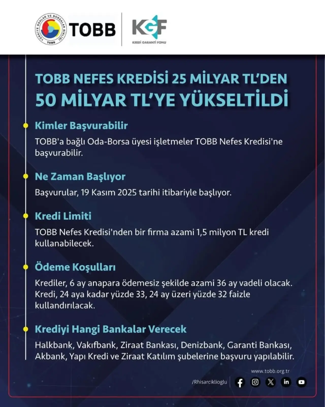 Başkan Özkasap açıklamasında şu ifadeleri kullandı: “TOBB öncülüğünde yürütülen Nefes Kredisi uygulaması kapsamında ikinci paket devreye alınmıştır. İlk etapta 25 milyar TL olan kredi hacmi, iş dünyamızın ihtiyaçları doğrultusunda 50 milyar TL’ye yükseltilmiştir. Bu adım, finansmana erişimde zorlanan KOBİ’lerimiz için önemli bir destek oluşturacaktır.”