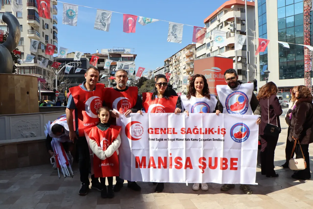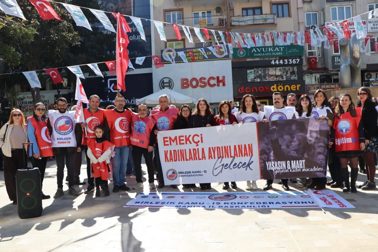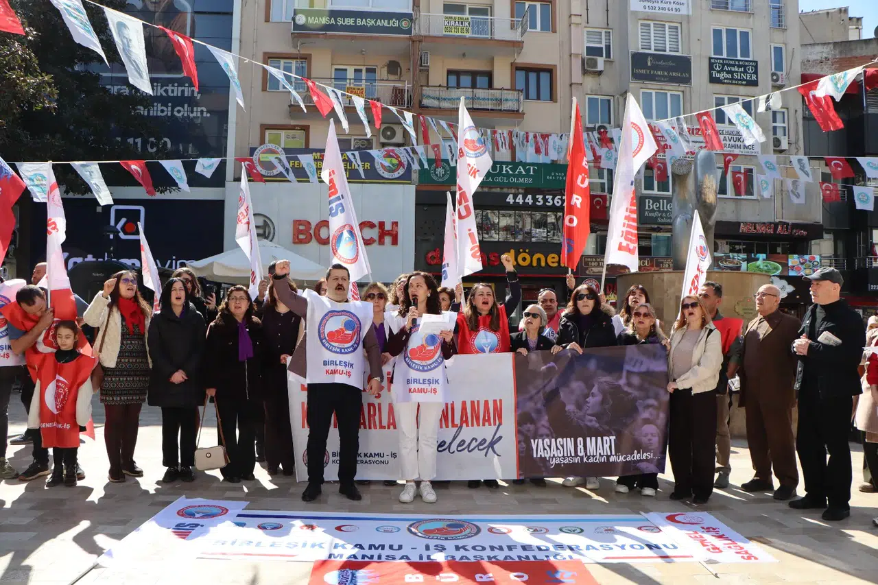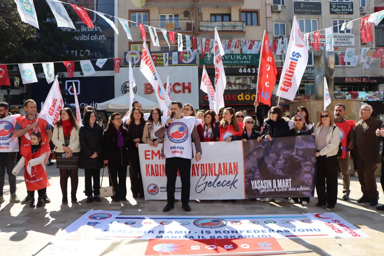 Manisa’da faaliyet gösteren Birleşik Kamu-İş Konfederasyonu 8 Mart Dünya Kadınlar Günü dolayısıyla Manolya Meydanında kadın eşitsizliğine yönelik eylem gerçekleştirdi. Kadınlar Günü’nün sembolik kutlama günü olmadığına vurgu yapılan eylemde 8 Mart’ın emekçi kadınların sömürüye, eşitsizliğe ve baskıya karşı yürüttüğü sınıf mücadelenin simgesi olduğuna vurgu yapıldı. Konfederasyondan yapılan açıklamada, Türkiye’de kamusal çalışma yaşamının uzun süredir neoliberal politikalarla yeniden yapılandırıldığı ifade edilerek güvencesizlik, düşük ücret, performans baskısı ve siyasal sadakate dayalı yönetim anlayışının kalıcı hale geldiği savunuldu. Açıklamada, bu dönüşümden en fazla etkilenen kesimin kadın emekçiler olduğuna değinildi. Konfederasyon adına açıklamada bulunan Manisa Genel Sağlık İş Yönetim Kurulu Üyesi Figen Bozkaya, “Kadın kamu emekçileri, aynı işi yapmalarına rağmen ücret eşitsizliği, yükselme ve yönetici pozisyonlarından dışlanma, mobbing, sendikal baskılar ve iş-yaşam dengesini imkânsız kılan uygulamalarla karşı karşıyadır” dedi.