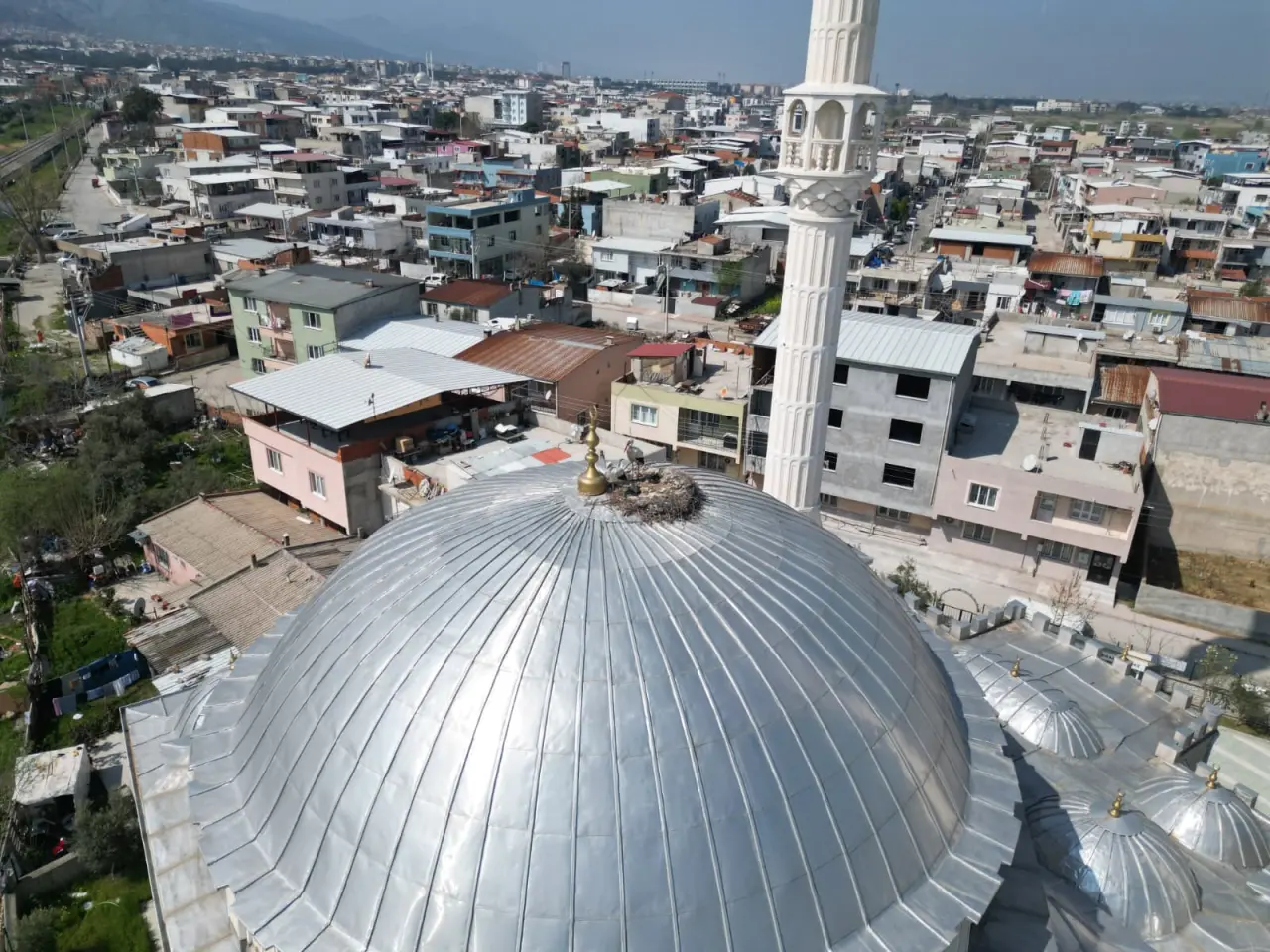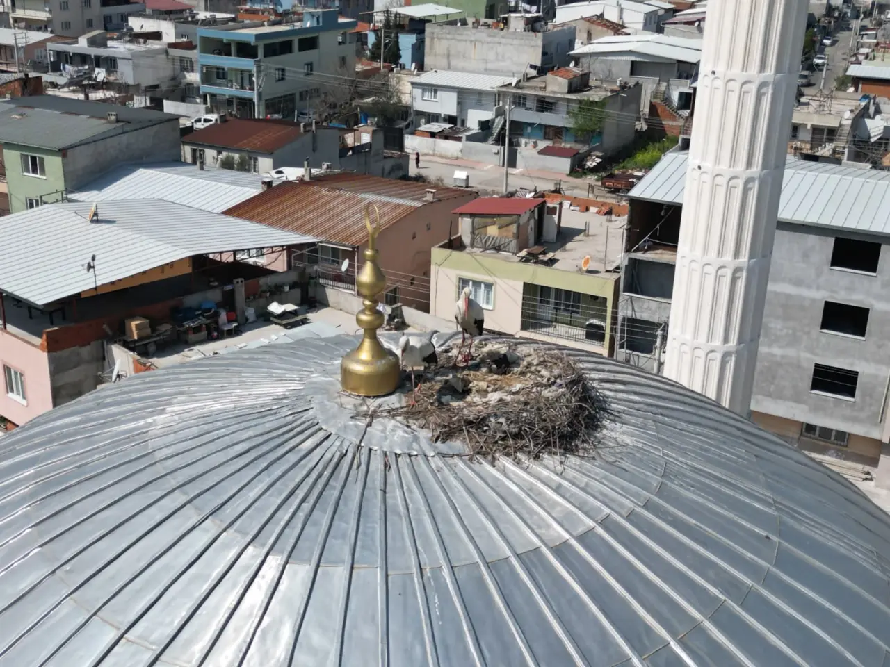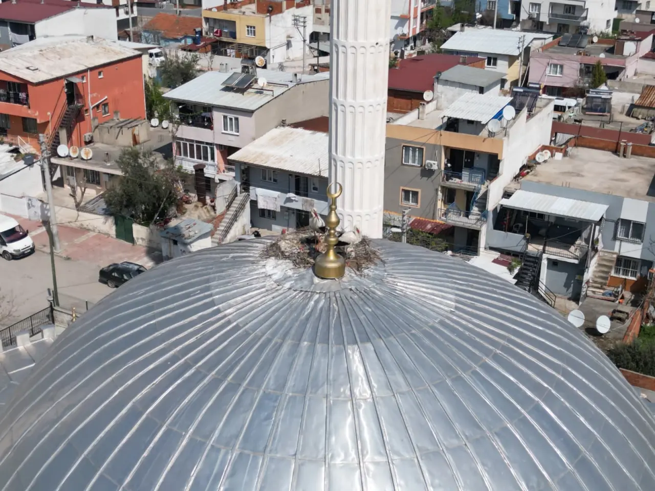 Ağaç dallarından cami kubbesine yuva yapan leylekler, her yıl kuluçkaya yatıyor. Sonbahara kadar cami kubbesini süsleyen leylek yuvası çevrede ilgi uyandırıyor. Mahalle sakinlerinden Şahin Arpacı, leylek yuvasınını drone ile yakından gözlemledi. Farklı açılardan çekilen fotoğraflarla ortaya güzel görüntüler çıktı.