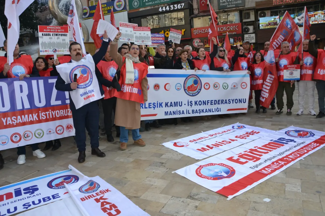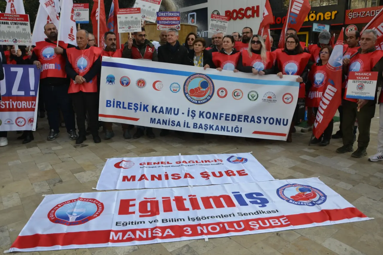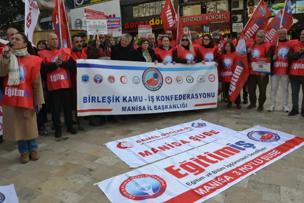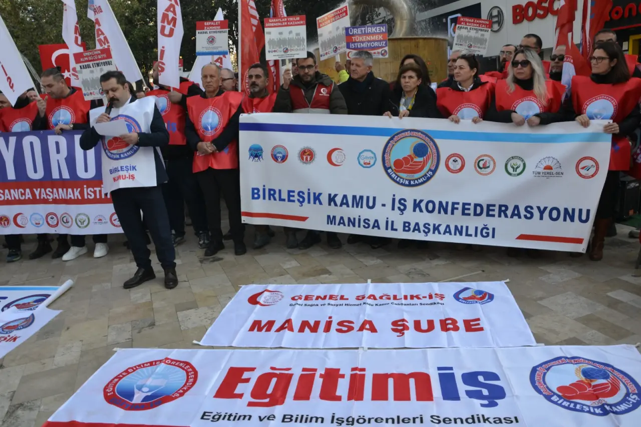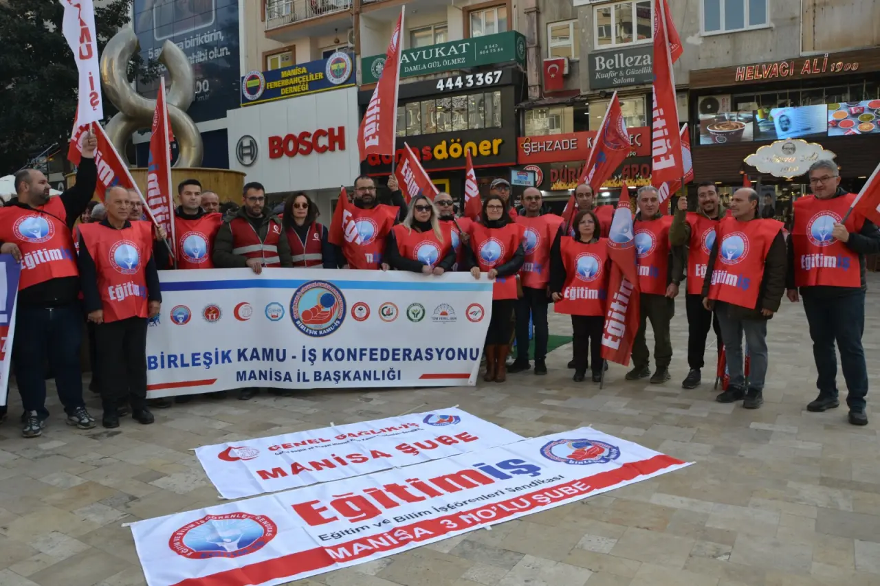Birleşik Kamu İş Konfederasyonu’na bağlı sendikalar, hükümetin bütçe politikalarına tepki göstermek amacıyla Manisa’da 1 günlük iş bırakma eylemi yaptı. Kamu emekçileri, Manolya Meydanı’nda toplanarak basın açıklaması gerçekleştirdi.