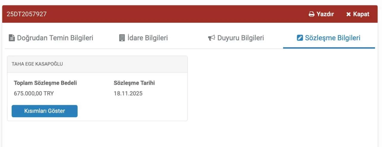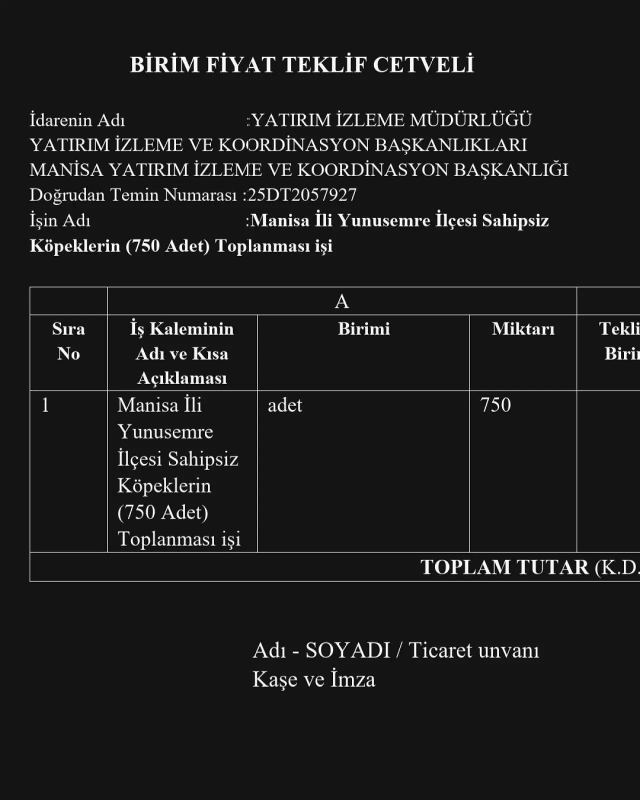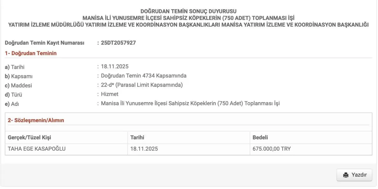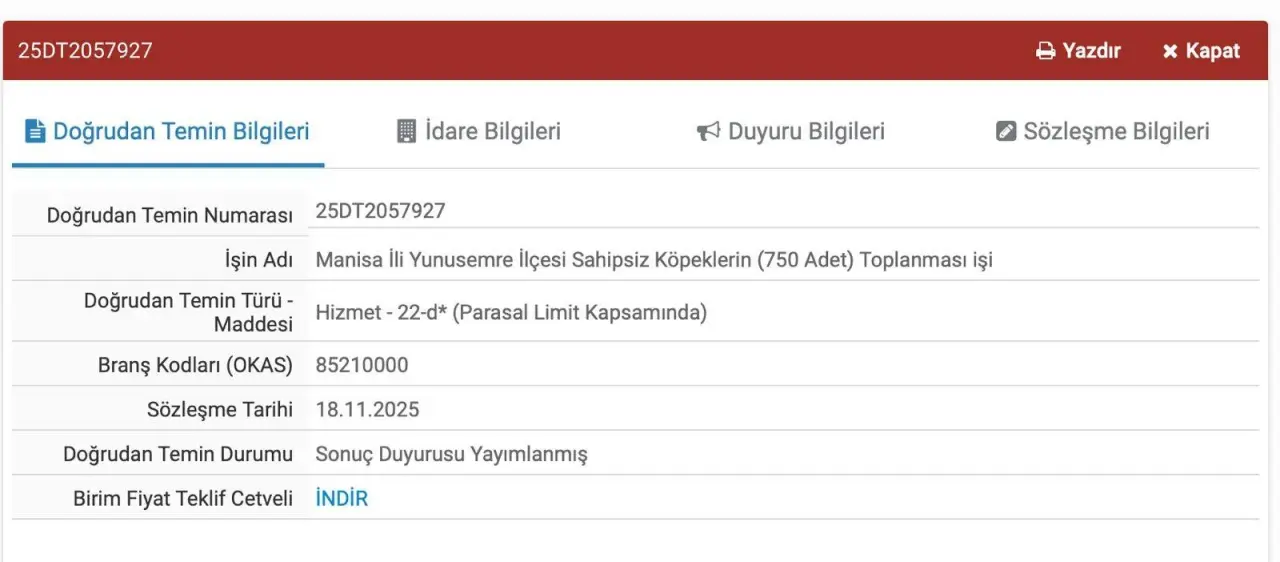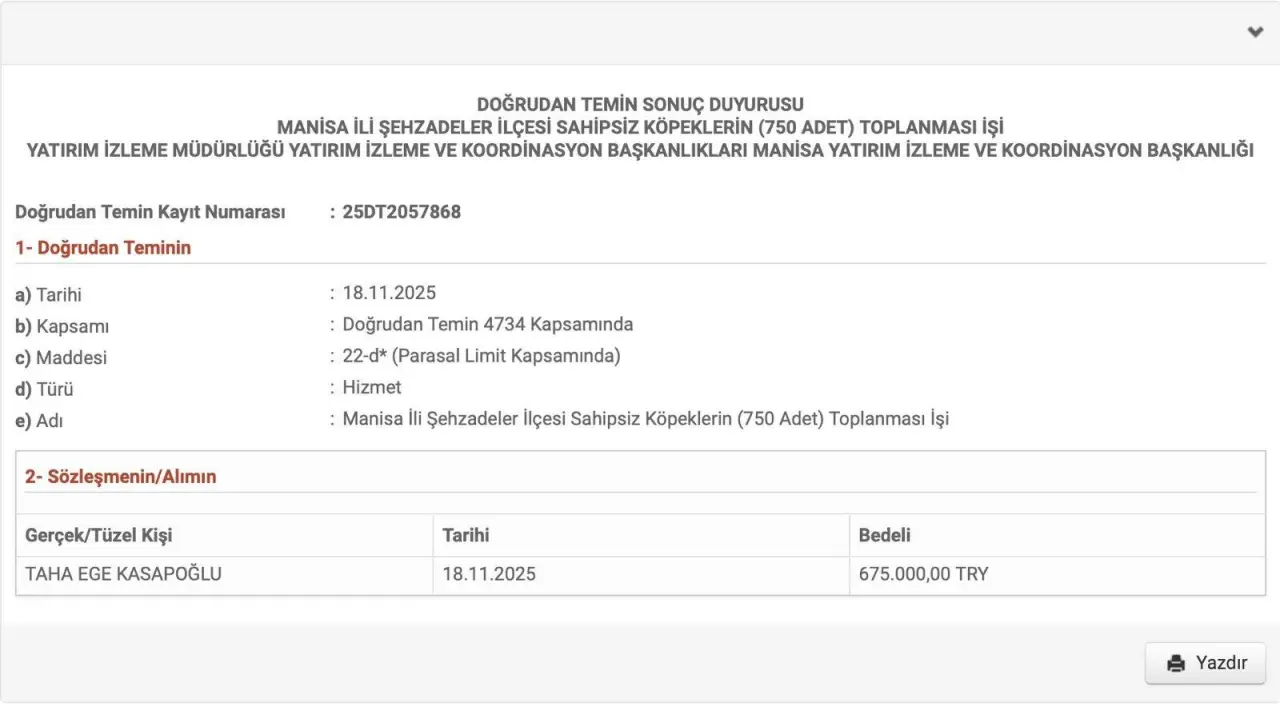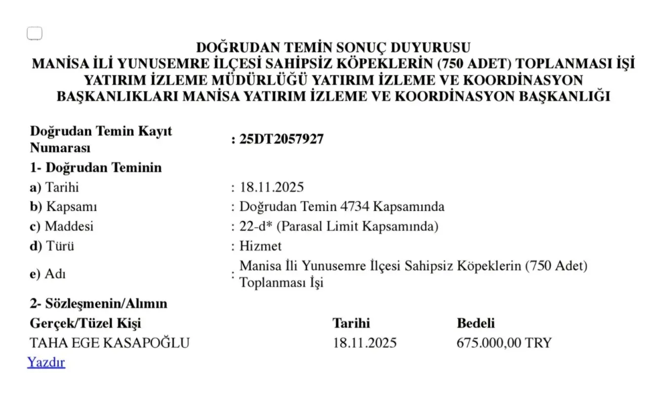 Paylaştığı belgelere göre YİKOB’un 18.11.2025 tarihinde doğrudan temin yoluyla; Şehzadeler ilçesinden 750 adet, Yunusemre ilçesinden 750 adet olmak üzere toplam 1.500 sahipsiz köpeğin toplanması işini, Taha Ege Kasapoğlu isimli bir şahıs firmasına verdiğini öne sürdü.
