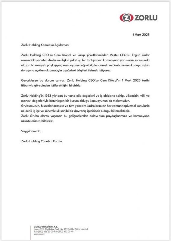 Grup şirketlerimizden Vestel CEO'su çalışma arkadaşım Ergün Güler ile konusu ve içeriği esas olarak tamamen iş ile ilgili yazışmalarımızın, önce sehven şirket içine yayılıp daha sonra kamuoyunda yer alması ile başlayan tartışmaların 28 yıldır görev yaptığım Zorlu Grubu'na zarar vermemesi için bu kararı aldım.