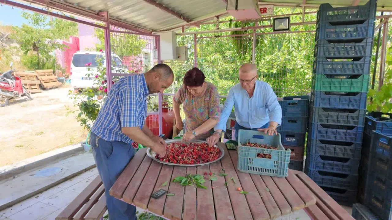 20 yıldır kiraz üreticisi olan emekli öğretmen Serpil Erbak "Sınıf öğretmenliği yaptım 33 yıl. Boş zamanlarımızı değerlendirdik kiraz üretimine başladık. Bu yıl bilindiği üzere Türkiye geneli don olayı yaşandı. Bizim arazimiz çok fazla etkilenmedi. Şu anda 3 ton üzeri ürün bekliyoruz. Tarlamızda 450 kiraz ağacımız var. Yardımcılarımız ağaçtan topluyor kasalarla geliyor, burada kalibresine göre ayırma yapıyoruz. Küçükleri 2. el olarak iç piyasaya gidiyor. Tüm üreticilerimiz işini şansa bırakmasın. Tarlalarımızı sigorta yaptıralım" dedi.