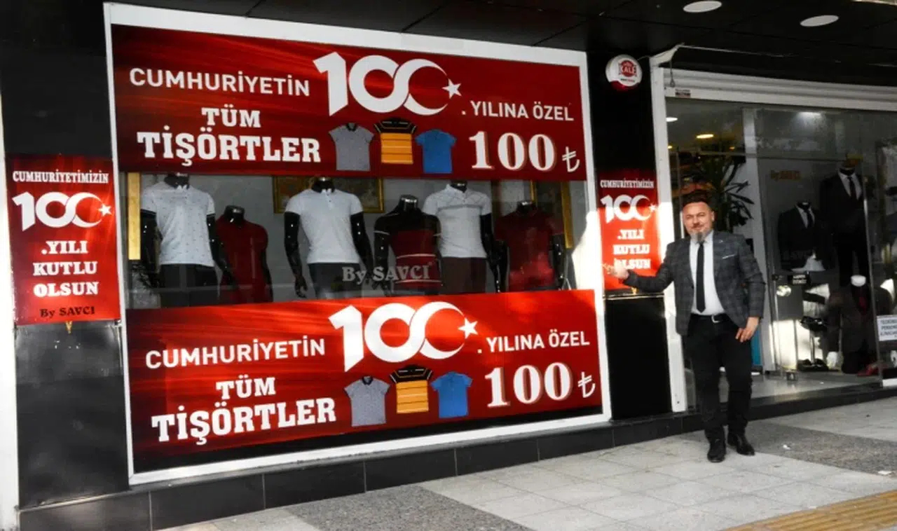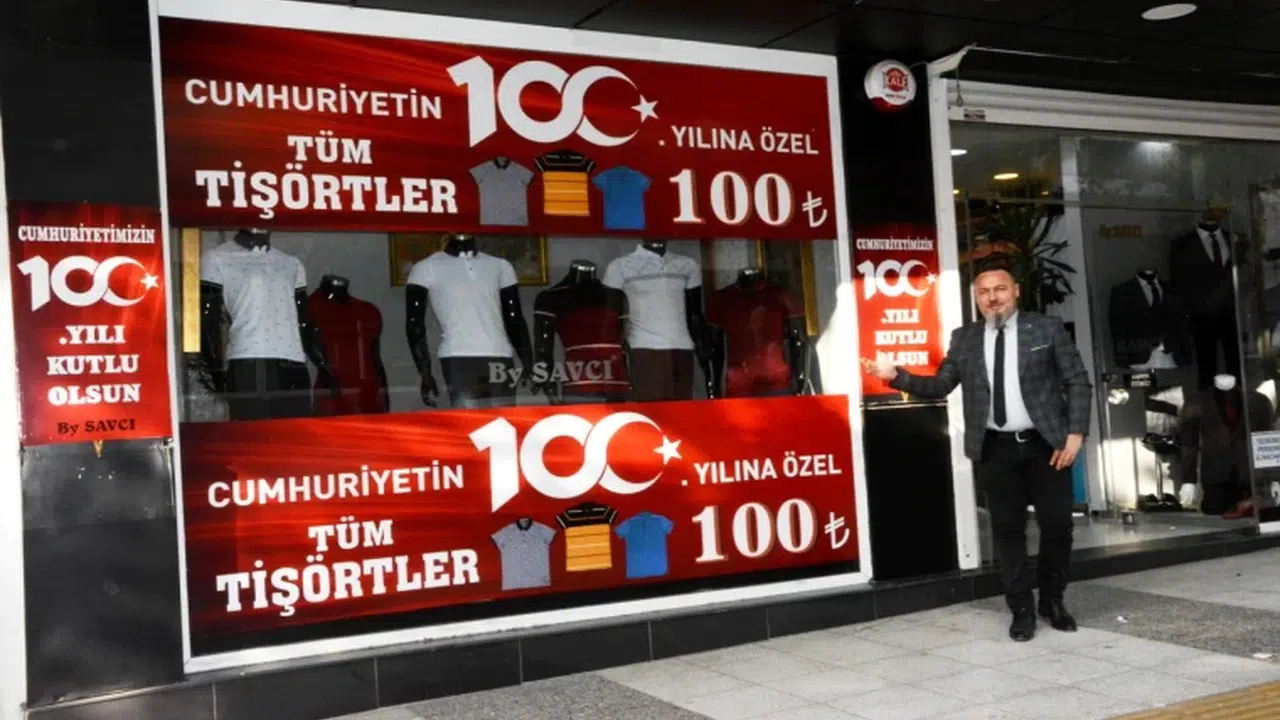 Manisa’nın Şehzadeler ilçesinde Vakıf İş Hanı girişinde 35 yıllık By Savcı firması Cumhuriyet’in 100. Yılına özel bir kampanya başlatarak fiyatı 500 TL’ye kadar olan tüm tişörtleri 100 TL’den satışa çıkardı. Kampanya Cumhuriyet’in 100. Yılına denk gelen 29 Ekim 2023 tarihine kadar devam edecek. By Savcı sahibi Savcı Özyolcu, “Türkiye Cumhuriyetimizin 100. Yılı kutlu olsun. Bu ülke içen canını feda eden bütün şehitlerimizi, gazilerimizi bir kez daha minnetle, saygıyla anıyorum. Bazen malımızdan, bazen canımızdan vereceğiz. Onlar bu ülkenin kurtarmak için canlarını feda etti. Biz de 35 yıllık köklü bir firma olarak Cumhuriyetimizin 100. Yılında böyle bir kampanyayı hayata geçirmek istedik” dedi. CÜNEYT HASÇELİK