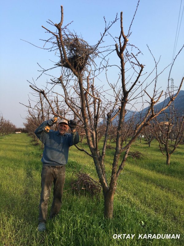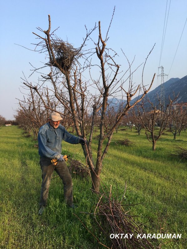 Bahçenin sahibi Musa Akçay ve budama yapan işçiler, yuvanın zarar görmemesi için budama işlemi bırakan Akçay'ın davranışı takdir topladı.