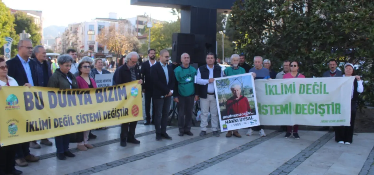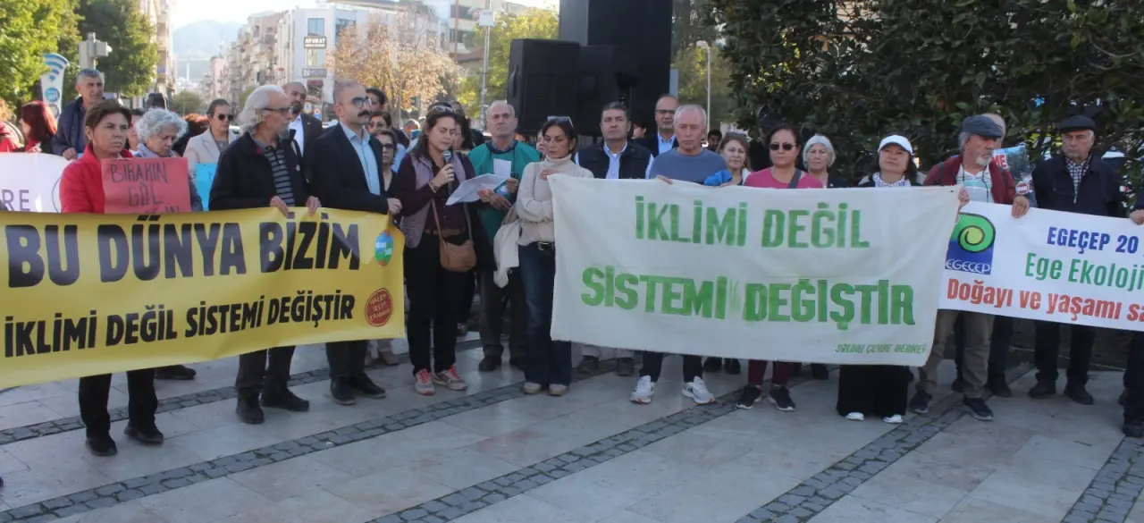 Doğa İçin Adalet Kampanya Grubu, Ekoloji Birliği, Halkın İklim Kanunu Kampanya Grubu, İklim Adaleti Koalisyonu, Toprağımızı Vermiyoruz Kampanya Grubu ve EGEÇEP adına basın açıklamasını EGEÇEP Eşsözcüsü Derya Lim gerçekleştirdi. Lim, “Bugün Brezilya’da, iklim krizi ile mücadele sözü veren devletlerarasında COP 30 müzakereleri sürerken, dünyanın dört bir yanında milyonlarca insan ise aynı cümleyle sokaklarda: Bu dünya bizim! Dünya halkları şu soruyu soruyor: Kimin için büyüyoruz, kimin için yaşıyoruz, ne için ölüyoruz? İklim krizi doğal değil, politik bir kriz. Krizin nedenini ekosistemin kendi varoluşuna ya da bireylerin yaşam tarzına bağlayanlar, doğayı ve emeği metalaştıran mevcut ekonomik düzeni bize unutturmak isteyenlerdir. Toprağın belleğinde, ormanların bilgeliğinde, suların maviliğinde koca bir gezegen yaşamı her an yeniden üretirken, bugün insanlığın mahkûm edildiği kapitalist sistem dünyadaki tüm halkların ve yeryüzündeki tüm canlıların sırtına basıp yükseliyor. Sistemin yarattığı eşitsizlik, adaletsizlik, savaşlar ve yoksulluk doğayı bir bütün hâlinde sömürüyor” diye konuştu.
