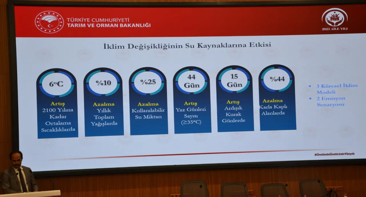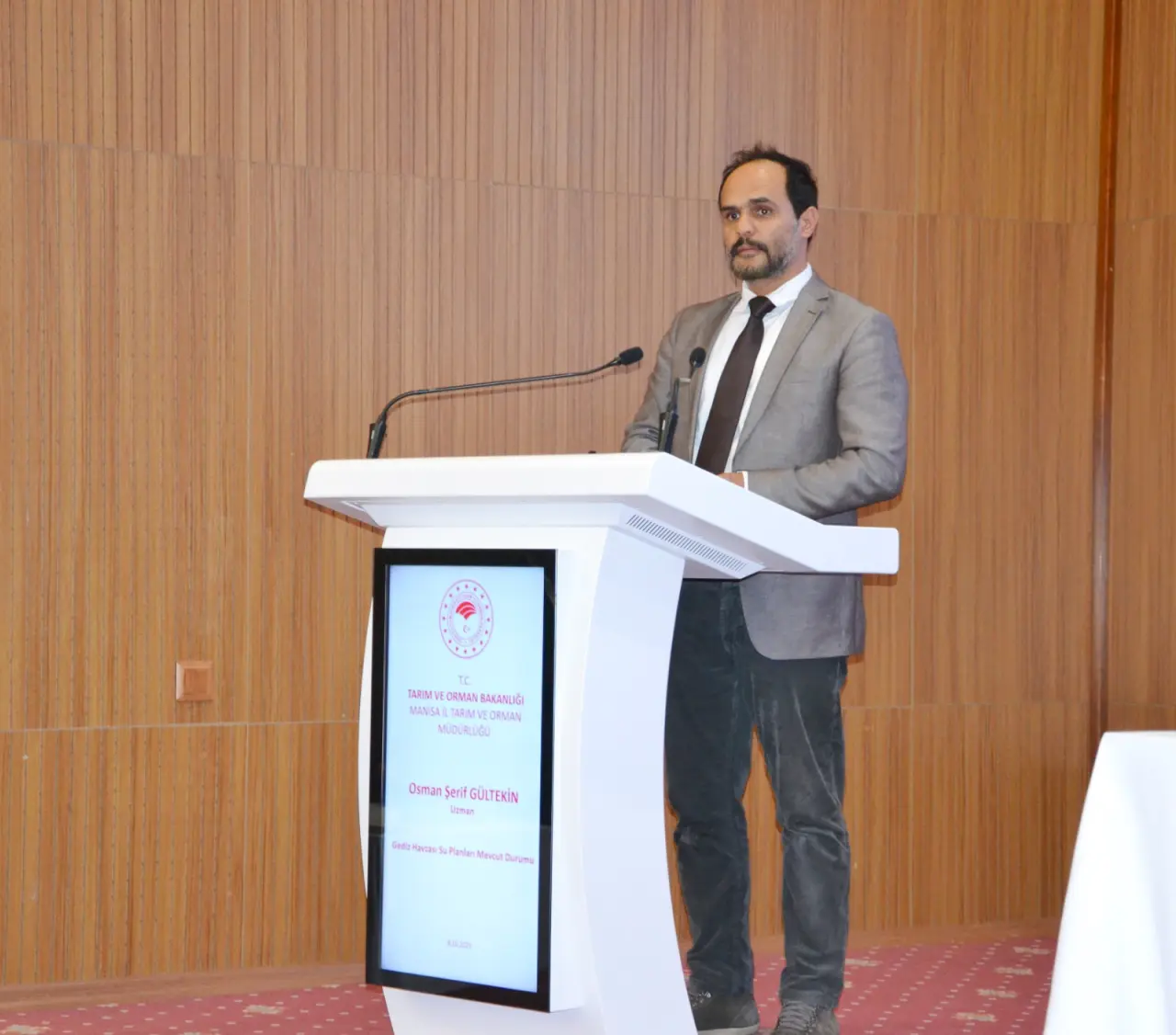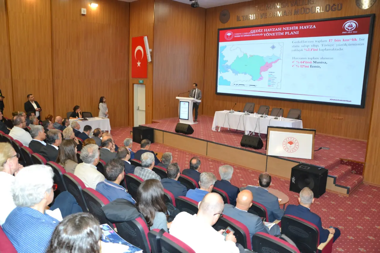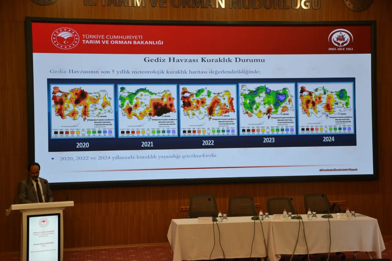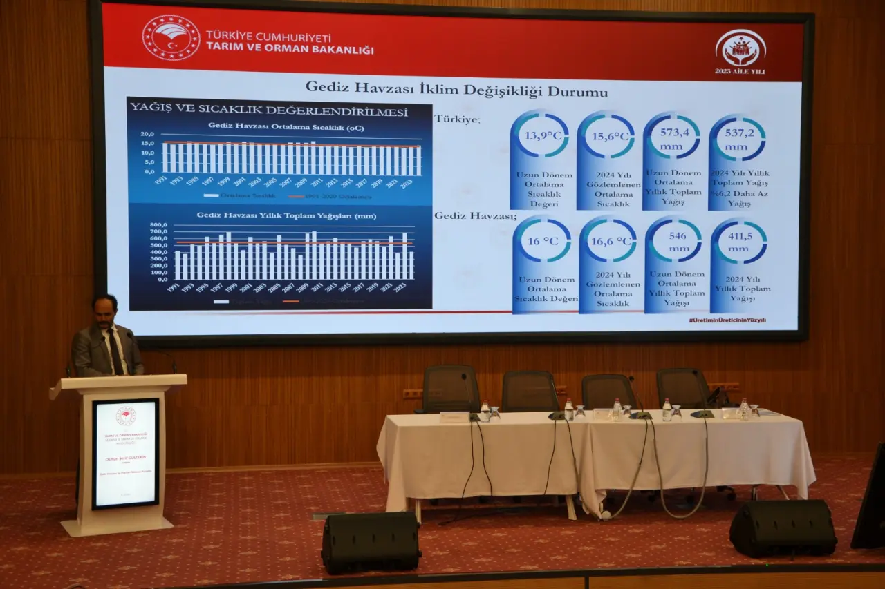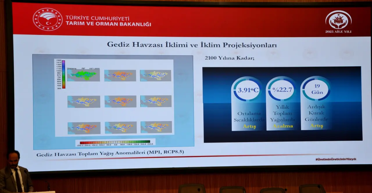 Tarım ve Orman Bakanlığı Su Yönetimi Genel Müdürlüğü Uzmanı Osman Şerif Gültekin, Gediz Havzası Su Planları mevcut durumuyla ilgili bir sunum yaptı. Gültekin, 2100 yılını kadar Gediz Havzasında sıcaklığın ortalama 3,91 derece artacağına, yağışların ise yüzde 22,7 azalacağına dikkat çekti.
