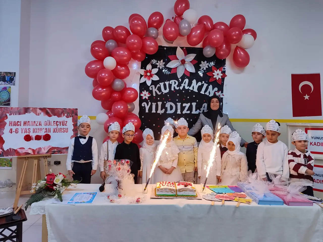 Manisa Akgedik Hacı Hamza Güleçyüz 4-6 yaş Kuran Kursu öğrencileri Kuran’ı Kerime geçen öğrencileri için "Kuran’ın Yıldızları” adlı etkinliğe imza attı. Etkinliğe Yunusemre İlçe Müftülüğü vaizelerinden Ayşe Avcı Atıcı da katılım gösterdi. Yapılan programda öğrenciler ilahiler okuyarak Kuran’ı Kerim’e geçmenin mutluluğunu yaşadı. Ayşe Avcı Atıcı ise kurs öğrencilerine ve etkinliğe katılanlara Kur’an okumanın önemini anlatan vaaz verdi. Kuran’a geçen öğrenciler ödüllendirilerek kurs öğretmenleri ile birlikte başarılarını kutlamak için pasta kesti. Etkinliğe kurs öğretmenlerinin yanı sıra öğrenciler ve veliler katılım gösterdi.
