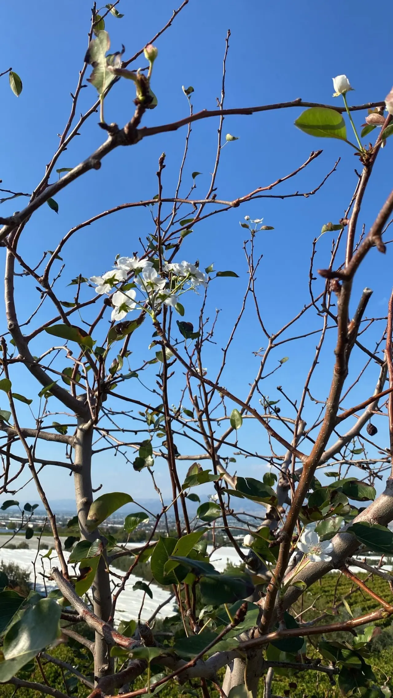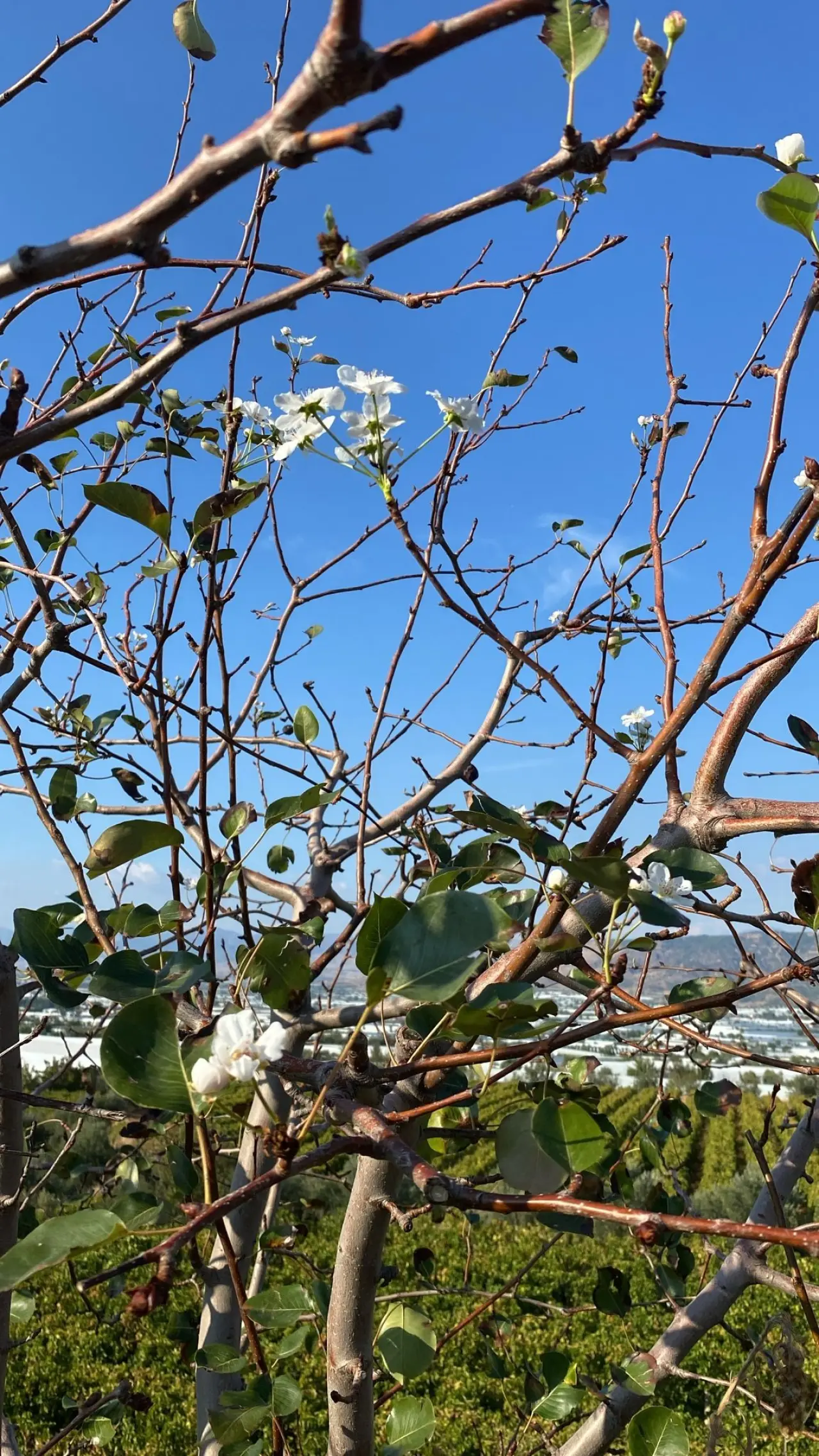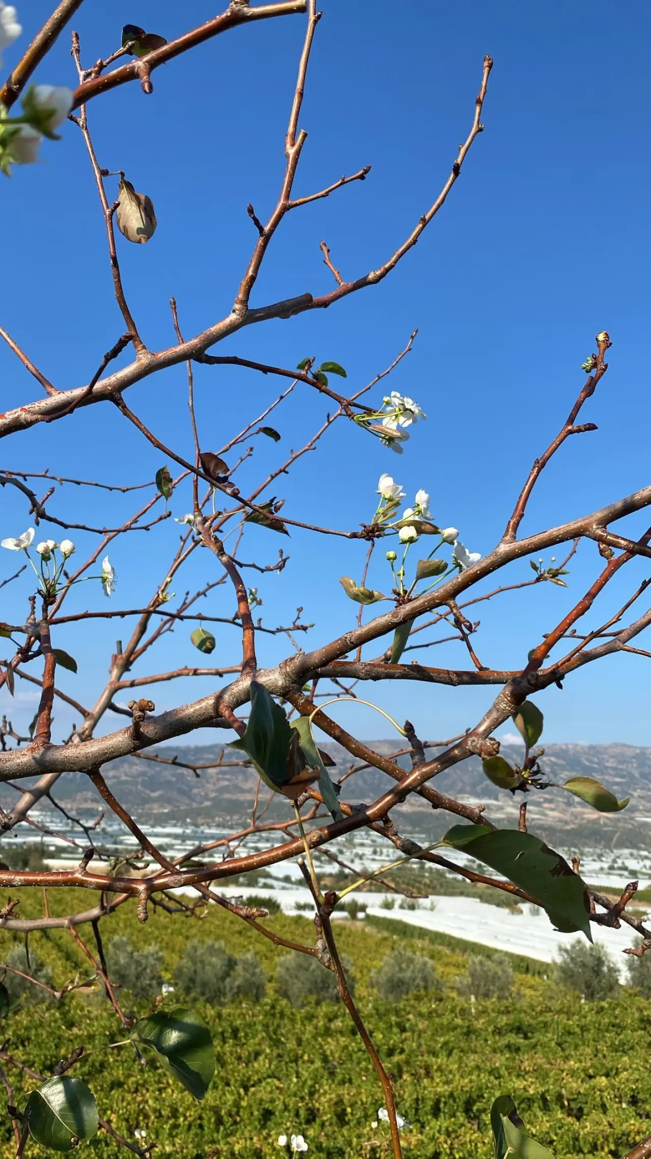 Emcelli Mahallesi'nde üzüm üreticiliği yapan Hüseyin Karcı, bağının kıyısına diktiği armut ağacının yeniden çiçek açtığını görünce hayrete düştü.