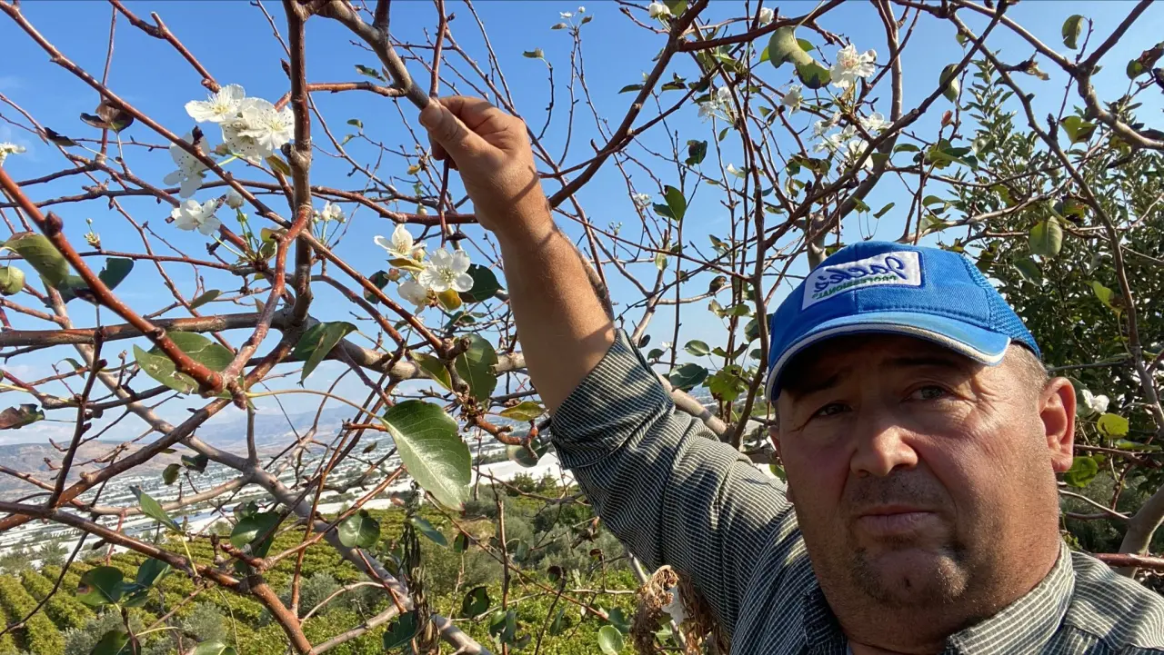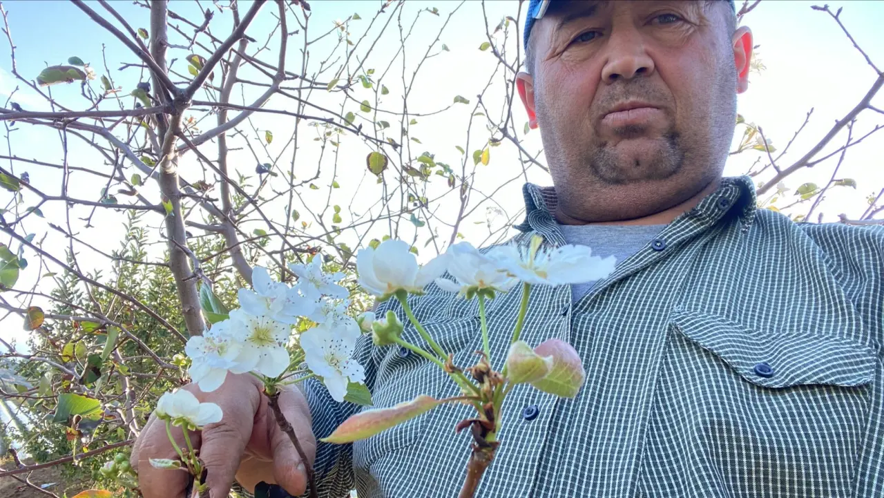 Çiftçi Hüseyin Karcı, "Mahallemizin Aktaş denilen bölgesinde üzüm bağım var. Bağımın kıyısına geçtiğimiz yıllarda armut diktim, bir yıldır ürün almaktayız. Bugün bağıma çalışmaya gittim, bir de baktım ki armut ağacı tekrar çiçek açmış. Hayretler içinde kaldım. Hava sıcaklıkları da düşmeye başladı, inşallah ikinci ürünü verir" dedi.