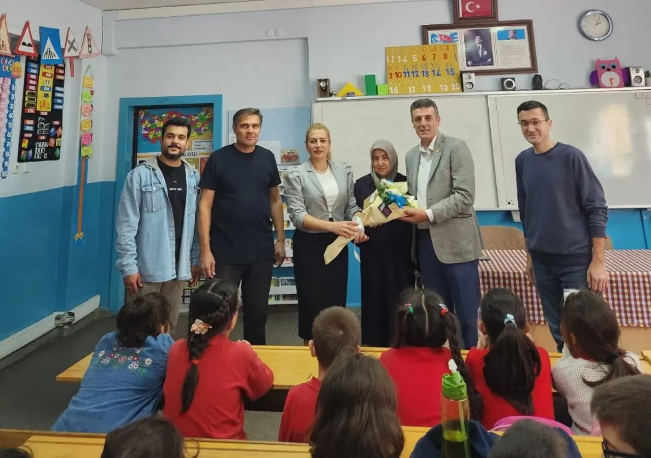 Etkinliğin sonunda Okul Müdürü Esra Yıldırım ve öğrenciler Kadriye Mahallesi Muhtarı Yasin Sarı ve eşi Ayşen Sarı'ya çiçek takdim ettiler.