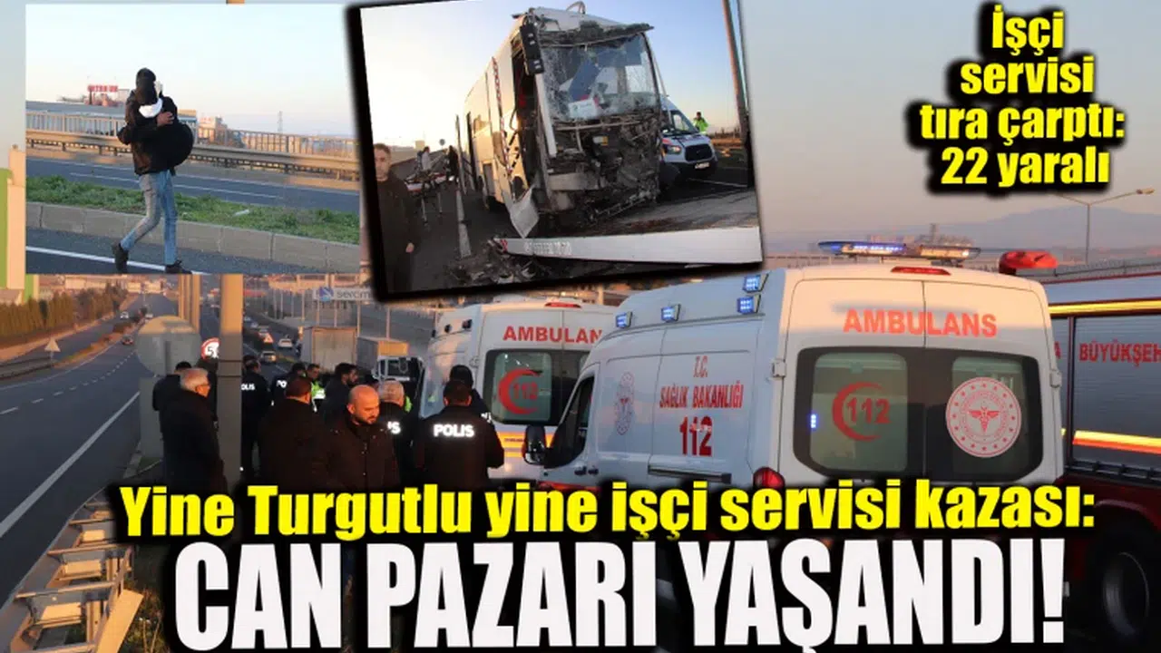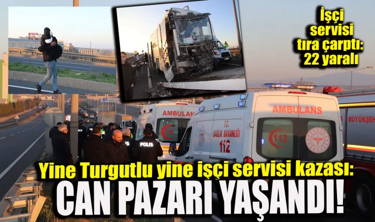 Manisa'nın Turgutlu ilçesinde işçi servisinin tıra arkadan çarpması sonucu meydana gelen kazada 22 kişi yaralandı.