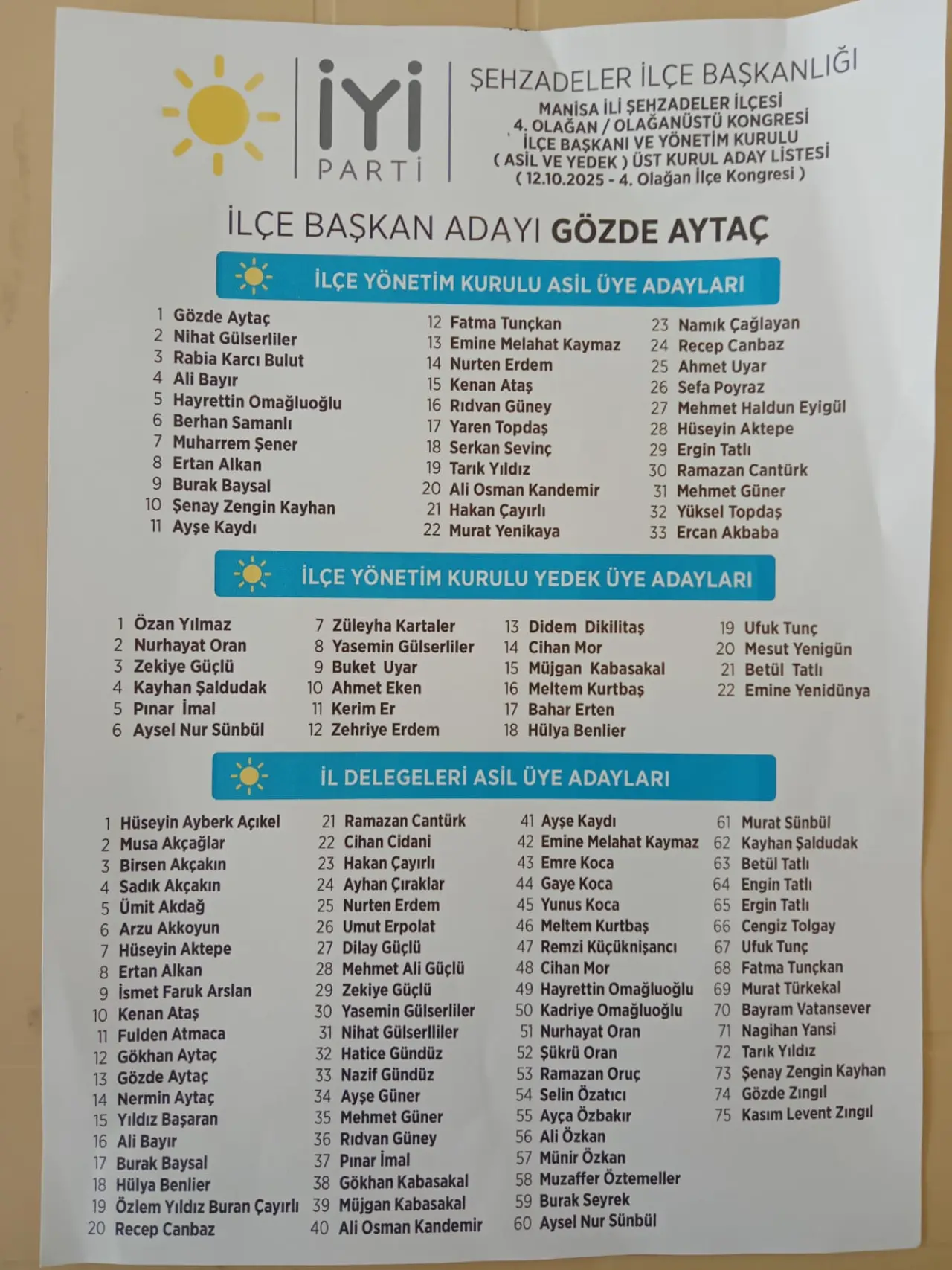 İYİ Parti Şehzadeler İlçe Başkanlığı 4. Olağan İlçe Kongresi MAKİ İkiz Kuleler Konferans Salonunda gerçekleştirildi. Mevcut başkan Gözde Aytaç 4. Olağan İlçe Kongresinde güven tazeledi. Kongrede konuşan İYİ Parti Şehzadeler İlçe Başkanı ve Başkan Adayı Gözde Akçakın Aytaç, konuşmasında birlik, mücadele ve adalet vurgusu yaptı. Aytaç, “Tarihi yeniden yazacak cesaret mürekkebi, İYİ’lik güneşinin altında döktüğümüz alın teridir.” sözleriyle partililere seslendi.