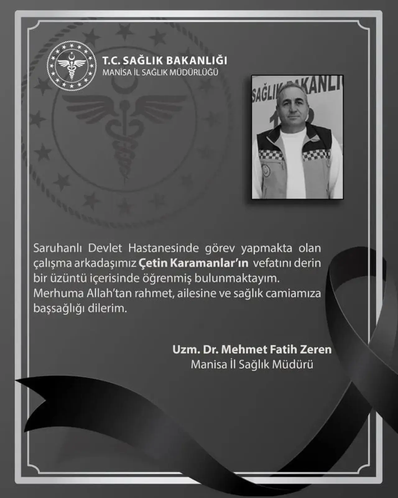Manisa İl Sağlık Müdürlüğü, Saruhanlı Devlet Hastanesi personeli Çetin Karamanlar’ın hayatını kaybettiğini duyurdu. İl Sağlık Müdürü Uzm. Dr. Mehmet Fatih Zeren, merhuma rahmet, ailesi ve sağlık camiasına başsağlığı diledi. Zeren mesajında, “Saruhanlı Devlet Hastanesi’nde görev yapmakta olan çalışma arkadaşımız Çetin Karamanlar’ın vefatını derin bir üzüntü içerisinde öğrenmiş bulunmaktayız. Merhuma Allah’tan rahmet; kederli ailesine ve Manisa sağlık camiasına başsağlığı dileriz,” ifadelerine yer verdi. Karamanlar’ın vefat haberi, mesai arkadaşları ve sevenleri arasında büyük üzüntüye neden oldu. Hastane yönetimi ve personel, taziye mesajlarıyla merhuma olan saygı ve bağlılıklarını dile getirdi.