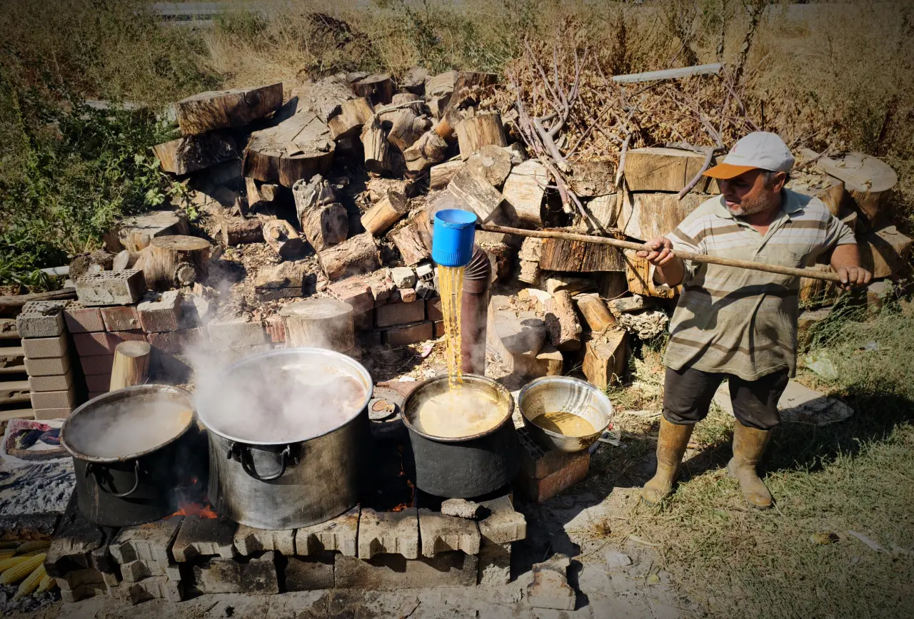 Manisa’nın Gördes ilçesine bağlı Güneşli Mahallesinde, kahvaltılarda sofraları süsleyen pekmez yapımı için gece gündüz kazanlar kaynatılıyor. Önce çuvallar içinde ezilerek şırası çıkarılan ve pekmez toprağıyla koyulaşıncaya kadar kazanlarda kaynatılarak yapılan pekmez hem gece hem gündüz yapılıyor. Yapıldıktan sonra cam kavanozlarda saklanarak kışın tüketilen pekmez, sofraları süslüyor. Üzüm bağı olanların kışlık pekmez yapımı için kazanları kaynattığını dile getiren Şerafettin Demirulus, "Pekmez, kahvaltılarımızın vazgeçilmezidir. Gördes’te hangi eve giderseniz pekmez bulursunuz. Başta kansızlık olmak üzere sağlık açısından çok faydalı olduğu biliniyor. Pekmezin kıvama gelebilmesi için uzun süre kaynatılması gerekiyor. Bu sabır işi. Her yıl bu zorlu süreci yaşıyoruz." şeklinde konuştu.
