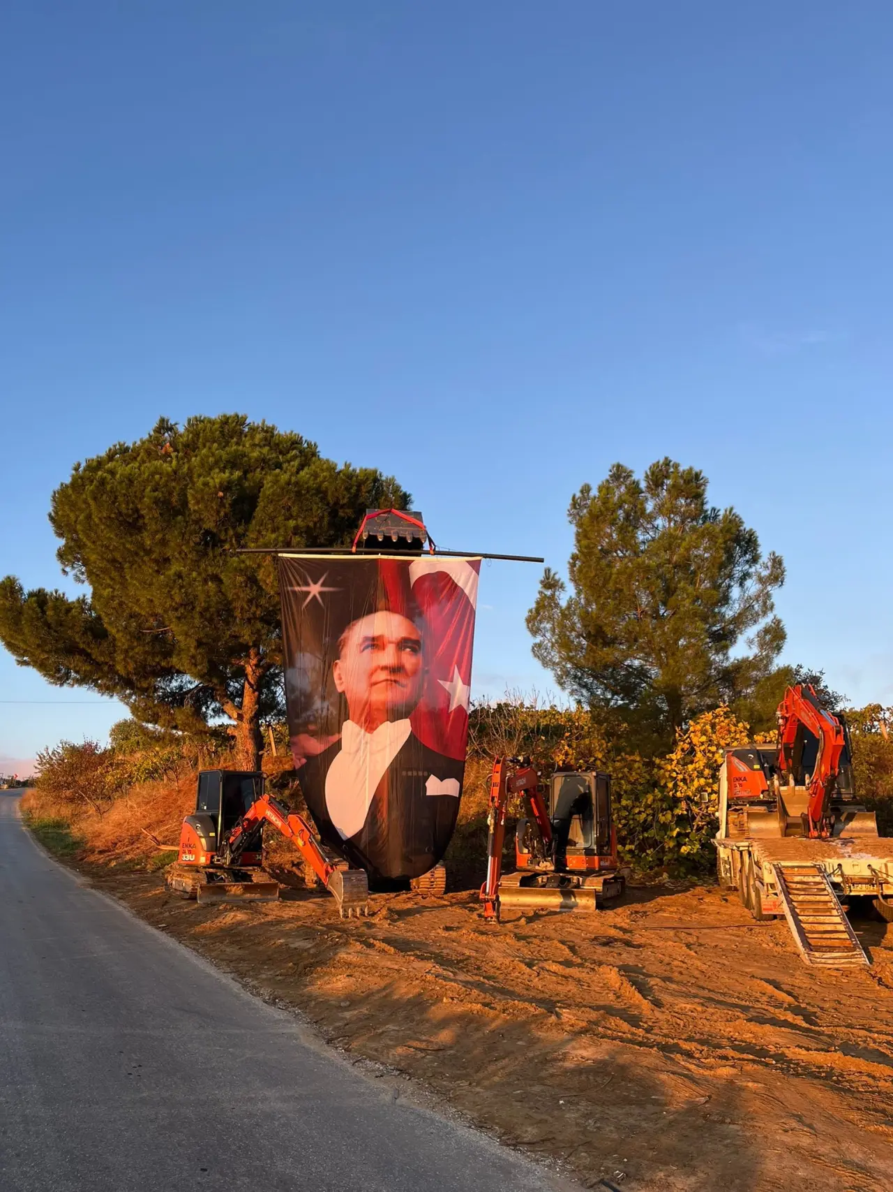 Manisa’nın Sarıgöl ilçesi Dadağlı Mahallesi’nde kepçe operatörü Erdem Aydın, Cumhuriyetin kuruluşunun 102’nci yılını farklı bir şekilde kutladı. Aydın, satın aldığı 4x6 metre ebadındaki Atatürk posterini kepçesine monte ederek köy girişine astı.