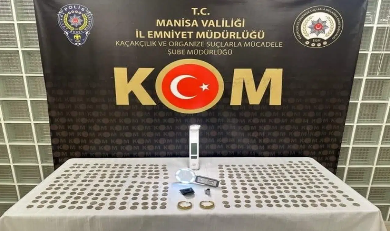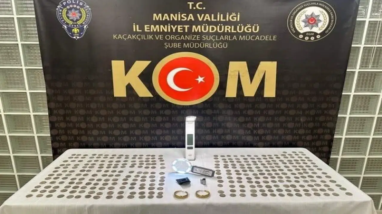 Manisa İl Emniyet Müdürlüğü Kaçakçılık ve Organize Suçlarla Mücadele Şube Müdürlüğü ekiplerince tarihi eser kaçakçılığının önlenmesine yönelik yürütülen çalışmalar neticesinde Kula'da bir ikamette ve araçta arama yapıldı. M.Y., H.C., B.T. ve A.C. isimli şahıslara ait ikamet ve araçlarda yapılan aramalarda 339 adet metal sikke, 2 adet sarı renkli küpe, 1 adet profesyonel koleksiyoner büyüteci, 1 adet minyatür mikroskop ve 1 adet şarjlı ayarlanabilir masa lambası ele geçirildi. Ele geçirilen objelere Kaçakçılık ve Organize Suçlarla Mücadele Şube Müdürlüğü ekiplerince el konulurken, M.Y., H.C., B.T. ve A.C. isimli şüpheli şahıslar, haklarında adli işlem başlatılarak gözaltına alındı.