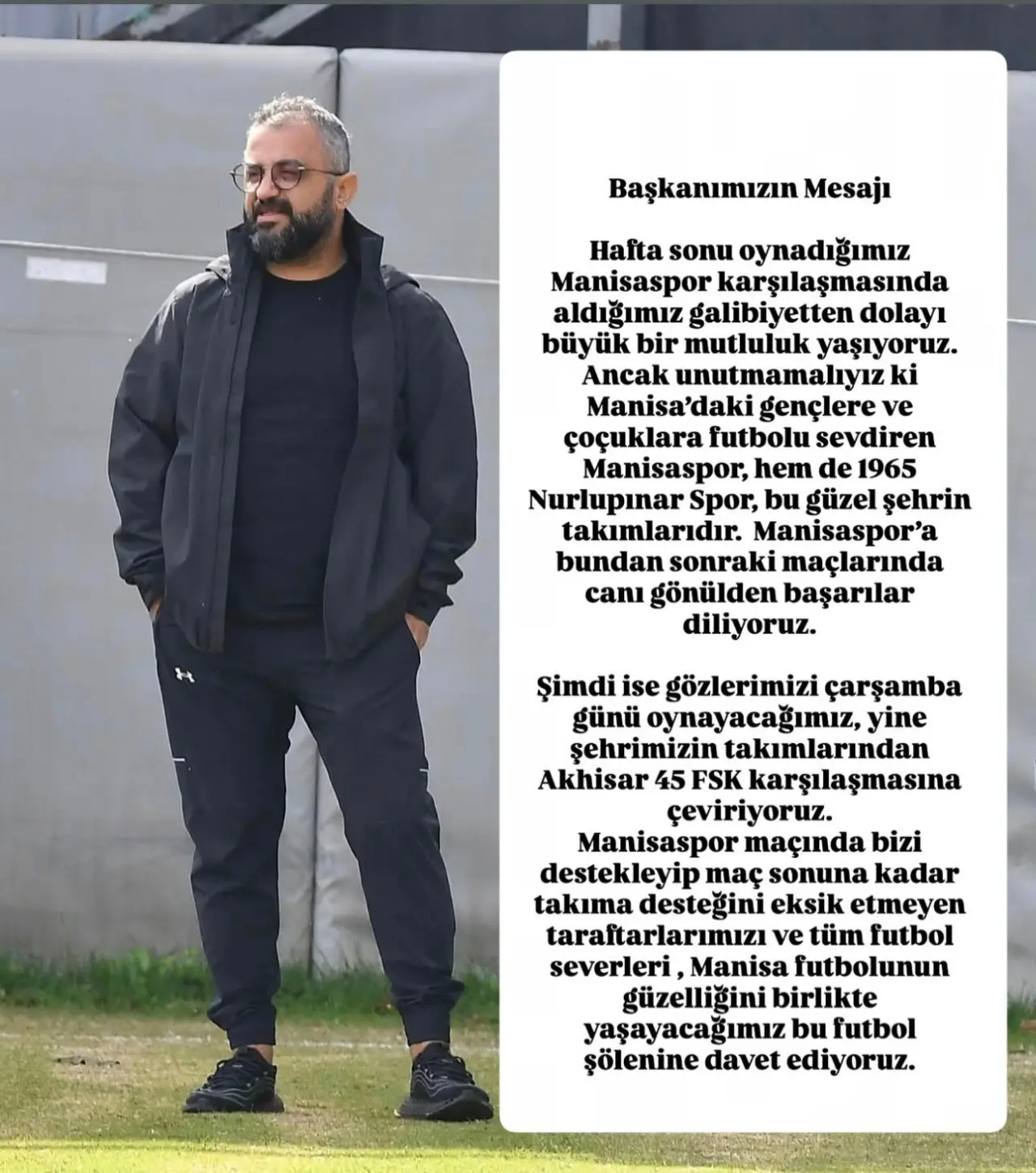 Başkan Lokman Aran, “Hafta sonu oynadığımız Manisaspor karşılaşmasında aldığımız galibiyetten dolayı büyük bir mutluluk yaşıyoruz. Ancak unutmamalıyız ki Manisa'daki gençlere ve çocuklara futbolu sevdiren Manisaspor hem de 1965 Nurlupınar Spor, bu güzel şehrin takımlarıdır. Manisaspor'a bundan sonraki maçlarında canı gönülden başarılar diliyoruz. Şimdi ise gözlerimizi çarşamba günü oynayacağımız, yine şehrimizin takımlarından Akhisar 45 FSK karşılaşmasına çeviriyoruz. Manisaspor maçında bizi destekleyip maç sonuna kadar takıma desteğini eksik etmeyen taraftarlarımızı ve tüm futbol severleri, Manisa futbolunun güzelliğini birlikte yaşayacağımız bu futbol şölenine davet ediyoruz” dedi.