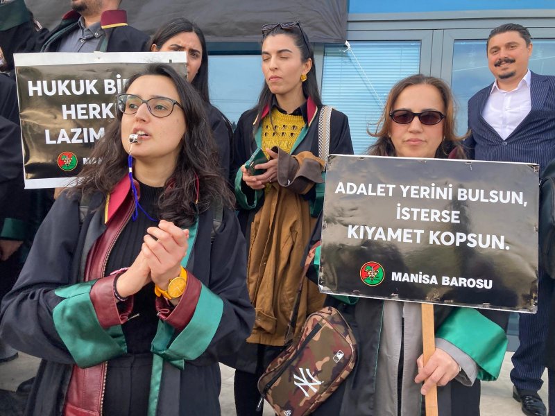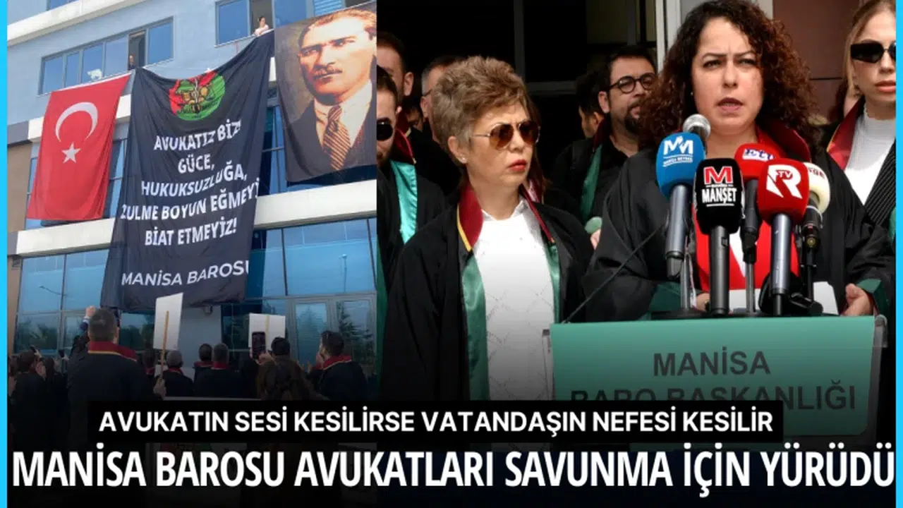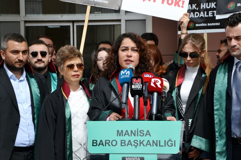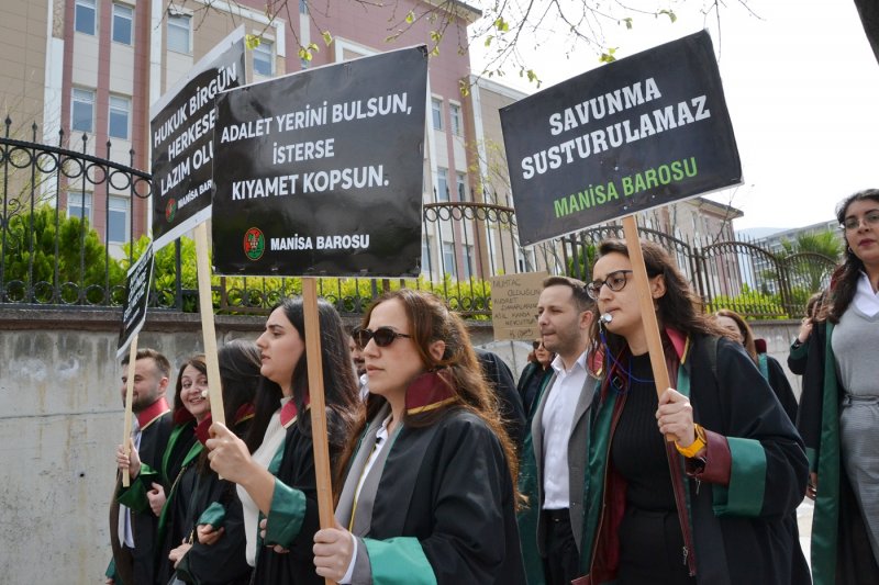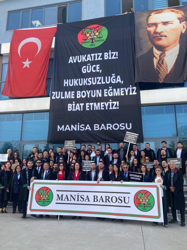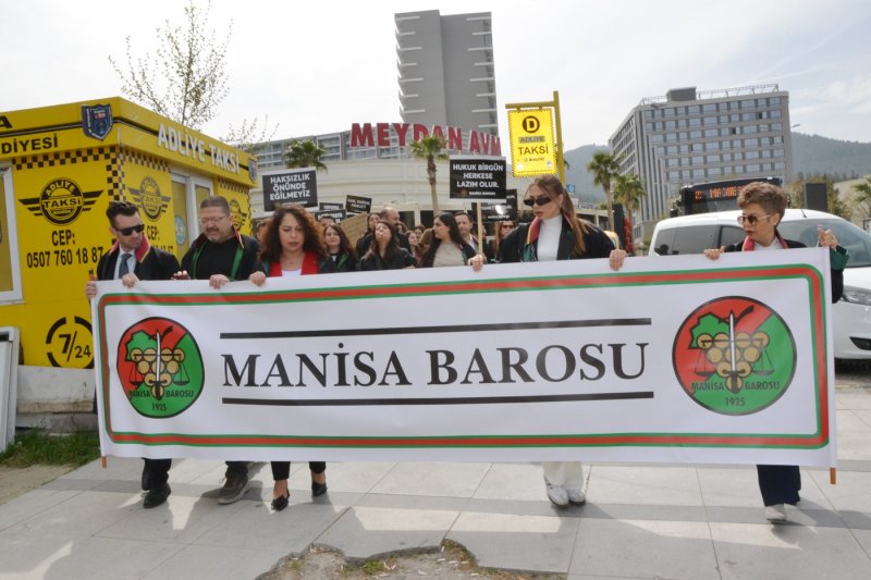 Manisa Barosu avukatları Manisa Adalet Sarayı önünde mesleği, baroları savunmak, hukuksuzluklara karşı çıkmak için seslerini yükseltti. Avukatlar, “Adalet yerini bulsun isterse kıyamet kopsun. Hukuk bir gün herkese lazım olur. Savunmaya dokunma. Nu zulüm, ne merhamet yalnızca adalet. Adalet olmadan düzen olmaz. Hukuksuzluğa geçit yok. Haksızlık önünde eğilmeyiz” pankartları taşıdılar. Avukatlar açıklamanın ardından Adalet Sarayı önünden Manisa Barosu binası önüne kadar sloganlar atarak yürüdüler. Manisa Barosu hizmet binasına “Avukatız biz, güce, hukuksuzluğa zulme boyun eğmeyiz, biat etmeyeceğiz” pankartı astılar.