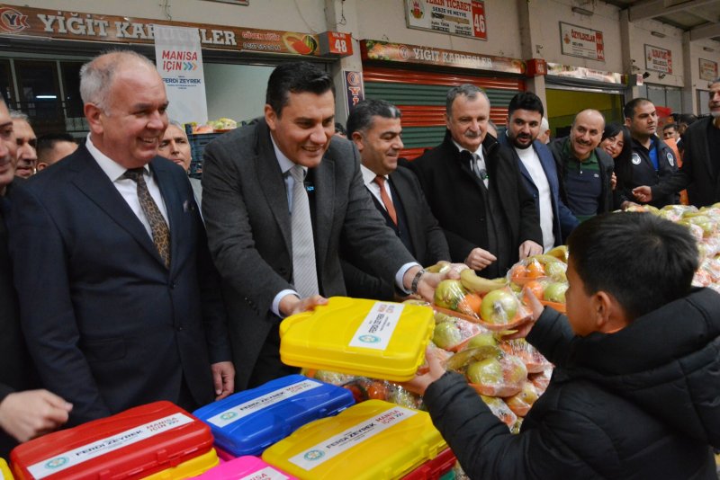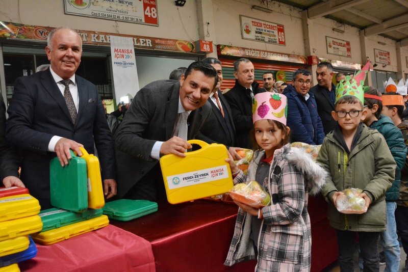 Manisa Sebze Meyve Komisyoncular ve Tüccarlar Derneği Başkanı Mahfuz Yalçın, Başkan Ferdi Zeyrek’e yerli üretime verdiği desteklerden dolayı teşekkür etti. Yalçın, yerli malı kullanımı konusunda herkese önemli görevler düştüğünü açıkladı. Konuşmaların ardından Başkan Zeyrek ve protokol üyeleri öğrencilere meyve ve hediye dağıttı. CÜNEYT HASÇELİK