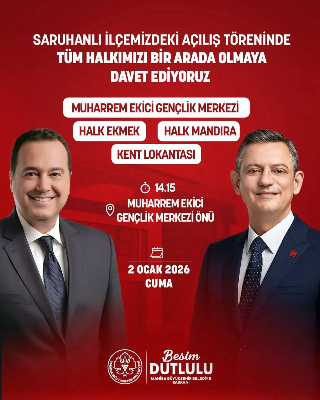 Başkan Dutlulu, CHP Genel Başkanı Özgür Özel’in katılımlarıyla, Saruhanlı’ya kazandırılan Muharrem Ekici Gençlik Merkezi, Kent Lokantası, Halk Ekmek ve Halk Mandıra projelerinin açılışlarının yapılacağını ifade etti.