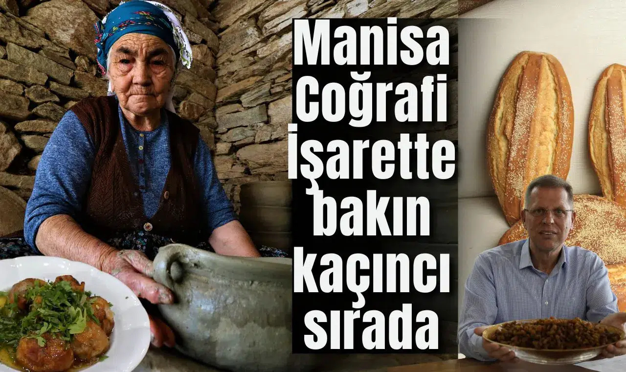 Manisa'daki coğrafi işaretli ürünler ve tescil yılları şöyle: "Kula El Halısı 1996, Yuntdağı El Halısı 1997, Gördes El Halısı 1997, Salihli Odun Köfte 2008, Salihli Kirazı 2008, Kırkağaç Kavunu 2009, Akhisar Uslu Zeytini 2012, Akhisar Domat Zeytini 2012, Manisa Taban Simidi 2018, Manisa Mesir Macunu 2018, Akhisar Köfte 2018, Manisa Sultani Çekirdeksiz Üzümü 2019, Kula Leblebisi 2019, Demirci Hünnabı 2020, Saruhanlı Çekirdeksiz Beyaz Üzüm 2021, Köprübaşı Çileği 2021, Alaşehir Asma Yaprağı 2021, Alaşehir Kapaması/Alaşehir Kapatması 2022, Alaşehir Ekmeği 2022, Akhisar Uslu Zeytinyağı 2022, Akhisar Domat Zeytinyağı 2022, Soma Zeytinyağı 2023, Soma Helvası 2023, Manisa Asma Yaprağı 2023, Kırkağaç Topalak Yemeği 2023, Emcelli Biberi 2023, Alaşehir Tahinli Pidesi 2023, Kırkağaç Pideli Paça/Kırkağaç Çakal Pideli Paça 2024, Demirci Kirazı 2024, Demirci Figani Efendi Eriği 2024, Büyükbelen Tekir Zeytini 2024 ve Gökeyüp Çömleği 2025."