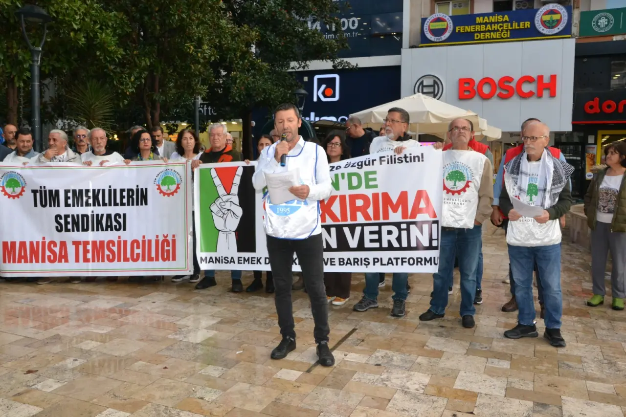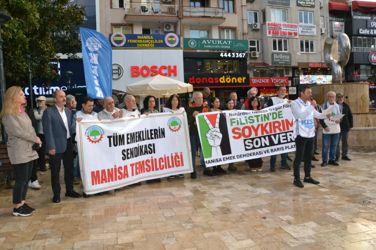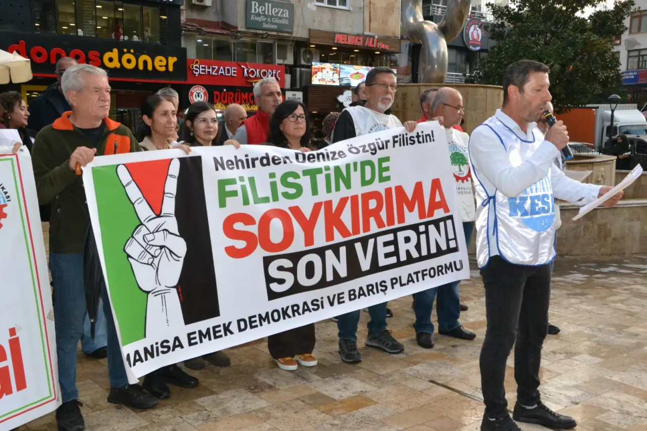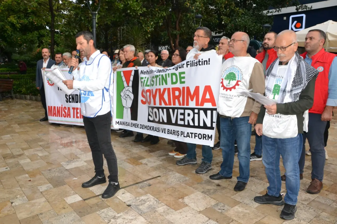 Manisa Emek Demokrasi ve Barış Platformu adına açıklama yapan Eğitim Sen Manisa Şube Başkanı Mehmet Ramazan, “Savaş ve soykırım politikalarının karşısında; Filistin’in yanındayız! Gazze’ye insani yardım ulaştırmak amacıyla yola çıkan Küresel Sumud Filosu, uluslararası sularda Netanyahu hükümetinin, askeri gemilerinin saldırısına uğramış, sivil gönüllüler zorla gözaltına alınmıştır. 40’tan fazla ülkeden yüzlerce gönüllünün içinde yer aldığı bu barışçıl girişime dönük saldırı, yalnızca uluslararası hukukun ihlali değil, insanlığın ortak vicdana yapılan bir darbedir! Gazze 18 yıldır uluslararası hukuka aykırı olarak ağır bir ablukayla kuşatma altındadır. İki yıldır süren ve artık bir soykırıma dönüşmüş savaşla birlikte işgalci Netanyahu hükümeti, bombaların ve mermilerin yanı sıra, açlığı ve yoksunluğu da bir silah olarak kullanmaktadır. Hastanelerin ilaçsız bırakılması, çocukların açlıktan ölmesi, en temel yaşam malzemelerinin dahi ülkeye sokulmaması, bu ablukayı şiddetin her türlüsünün yaşandığı bir insanlık trajedisine dönüştürmektedir. Sumud Filosu’na yapılan müdahale, yalnızca insani yardımı engelleme değil, dayanışmayı ve küresel adalet mücadelesine de yapılmış açıktan bir saldırıdır. Geçtiğimiz yıl Madleen ve Handala gemilerinin aynı şekilde engellenmesi hala hafızalarımızdaki yerini korumaktadır. AK Parti iktidarının 2016’da İsrail ile “normalleşme” adına Mavi Marmara davasını düşürerek bu katliamı kapatmaya çalıştığı da unutulmamalıdır. Sumud Filosu ise tüm bu engellemelere karşı dünyanın dört bir yanından halkların barışçıl iradesini taşıyan ve tarihe geçen yeni bir girişimdir. Filo’nun silahsız ve gönüllü insanlardan oluşması, iki temel mesaj taşımaktadır: Birincisi, güç dengesinin ne kadar eşitsiz olduğuna bakılmaksızın, Siyonist işgal ve ablukaya meşruiyet tanınmaması gerektiği, ikincisi ise, devletlerin suç ortaklığına karşı halkların ortak eylemleriyle tarihin akışına yön verilebileceğinin gösterilmesidir. Sumud, Arapçada “sebat” ve “kararlılık” demektir; bu filo, adının hakkını vererek dünyanın gözü önünde İsrail’in her şeye mutlak gücü olmadığını kanıtlamıştır” dedi.
