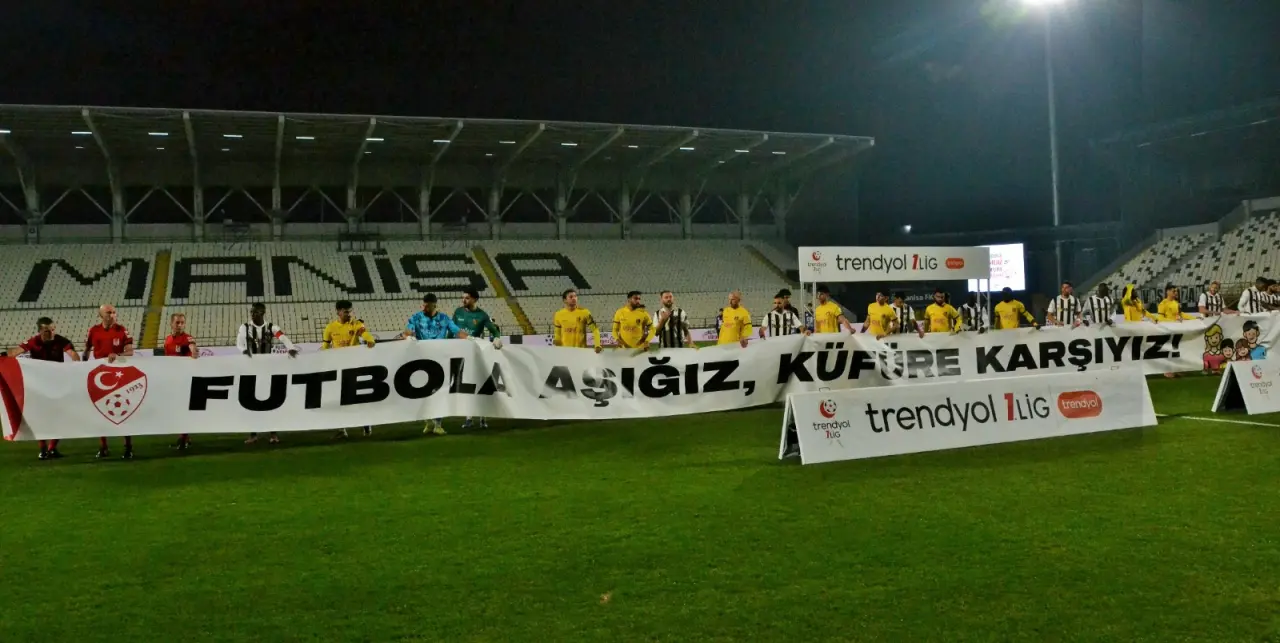 İki takım futbolcuları sahaya "Futbola aşığı küfüre karşıyız" pankartıyla çıktı.